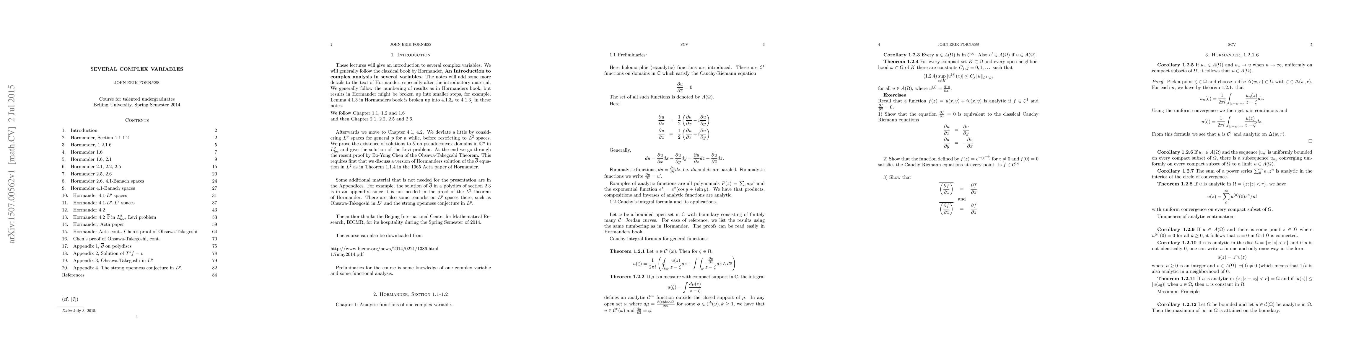 Summary: These lecture notes provide an introductory overview of the theory of several complex variables, focusing on fundamental concepts and foundational techniques in the field. Aimed at beginners, they lay the groundwork for further study in complex analysis with multiple variables.