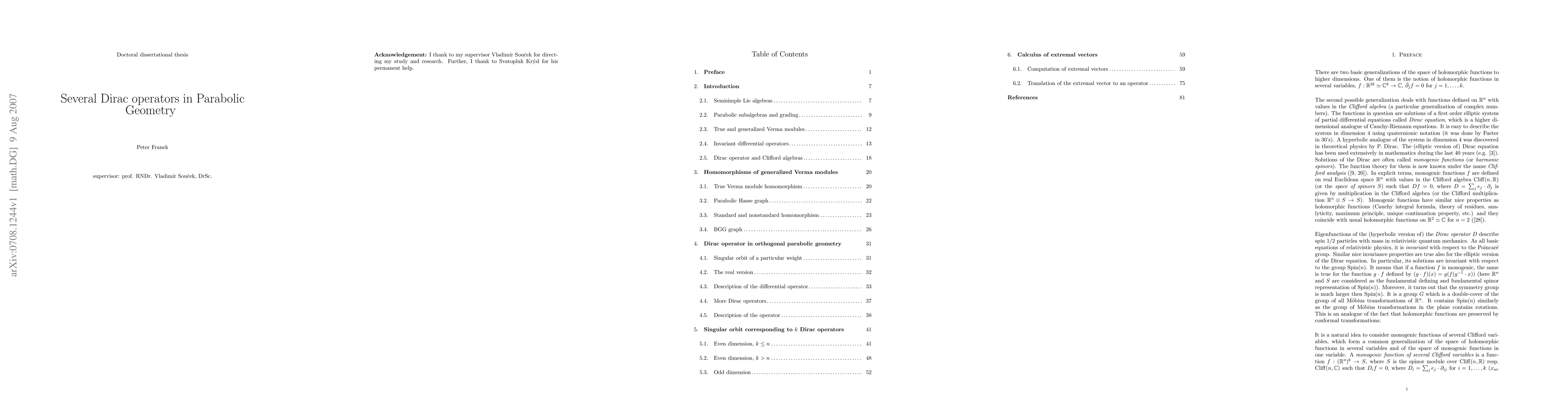 In this thesis, we show the existence of a sequence of differential operators starting with with the Dirac operator in k Clifford variables, $D=(D_1,..., D_k)$, where $D_i=\sum_j e_j\cdot \partial_{ij}: C^\infty((\R^n)^k,\S)\to C^\infty((\R^n)^k,\S)$ ($\S$ is the spinor module). This operator is the Cauchy-Riemann operator for n=2 and its resolution is the Dolbeault complex. For higher n, the resolution of D is not known in general. While this problem was treated many times in the language of Clifford analysis and some partial results are known, we give a description of this operator in Parabolic geometry, which is a special type of Cartan geometry modeled on $G/P$, where P is a Parabolic subgroup of G. We construct sequences of invariant differential operators starting with the Dirac operator in several variables and assume that these sequences coinside in some cases with the resolution. We describe the structure of these sequences precisely in case the dimension $n$ is odd and give a conjecture that these sequences have similar structure for n even, $k\leq n/2$ (the s.c. {\it stable range}). We also give some information about these sequences in case n even, k>n/2. In the last chapter, explicite formulas for the operators are derived for the case k=2.