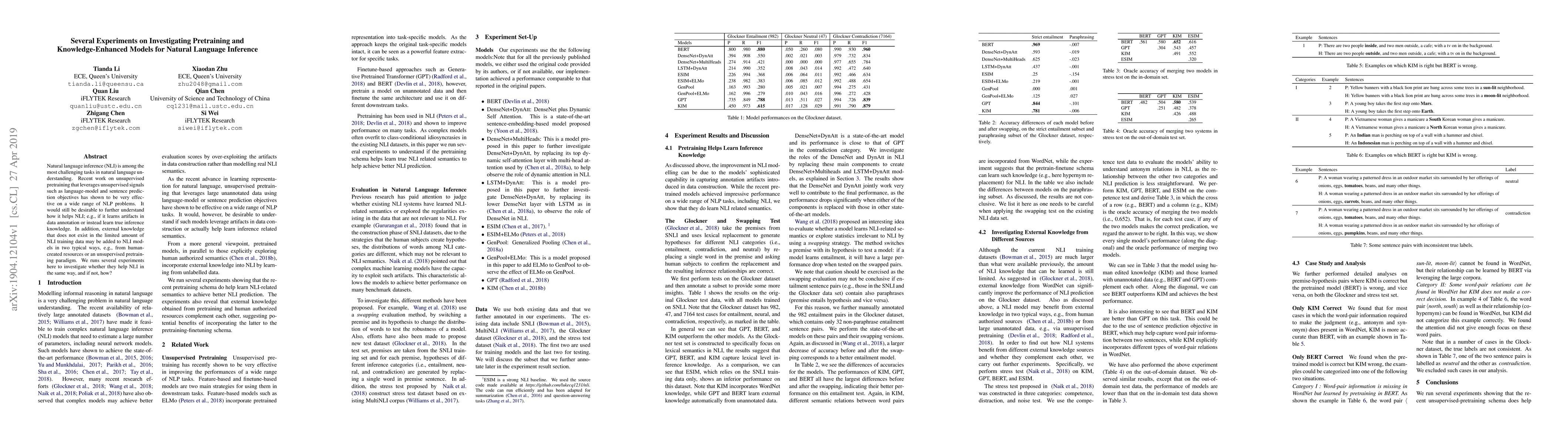 Natural language inference (NLI) is among the most challenging tasks in natural language understanding. Recent work on unsupervised pretraining that leverages unsupervised signals such as language-model and sentence prediction objectives has shown to be very effective on a wide range of NLP problems. It would still be desirable to further understand how it helps NLI; e.g., if it learns artifacts in data annotation or instead learn true inference knowledge. In addition, external knowledge that does not exist in the limited amount of NLI training data may be added to NLI models in two typical ways, e.g., from human-created resources or an unsupervised pretraining paradigm. We runs several experiments here to investigate whether they help NLI in the same way, and if not,how?