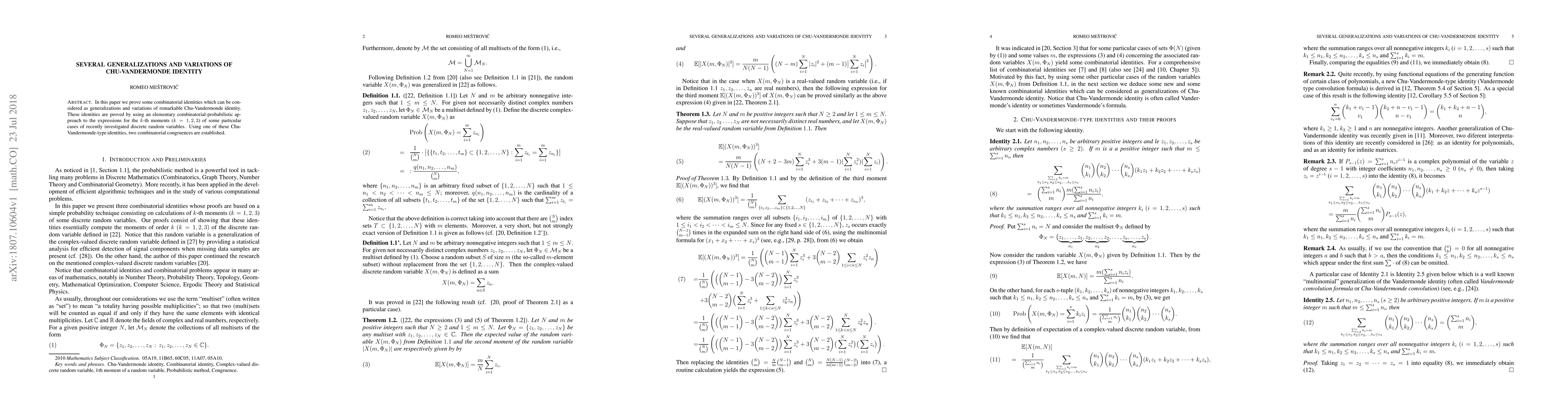 This paper proves several combinatorial identities that generalize and vary the Chu-Vandermonde identity, employing an elementary combinatorial-probabilistic approach to the moments of specific discrete random variables. Additionally, it establishes two combinatorial congruences using one of these identities.