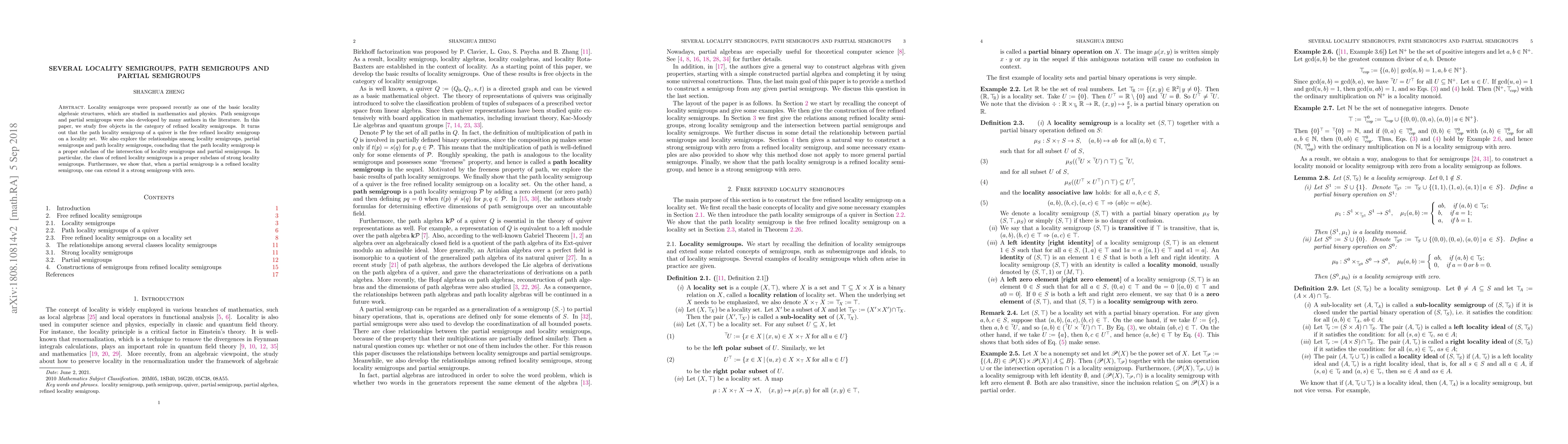 Locality semigroups were proposed recently as one of the basic locality algebraic structures, which are studied in mathematics and physics. Path semigroups and partial semigroups were also developed by many authors in the literature. In this paper, we study free objects in the category of refined locality semigroups. It turns out that the path locality semigroup of a quiver is the free refined locality semigroup on a locality set. We also explore the relationships among locality semigroups, partial semigroups and path locality semigroups, concluding that the path locality semigroup is a proper subclass of the intersection of locality semigroups and partial semigroups. In particular, the class of refined locality semigroups is a proper subclass of strong locality semigroups. Furthermore, we show that, when a partial semigroup is a refined locality semigroup, one can extend it a strong semigroup with zero.