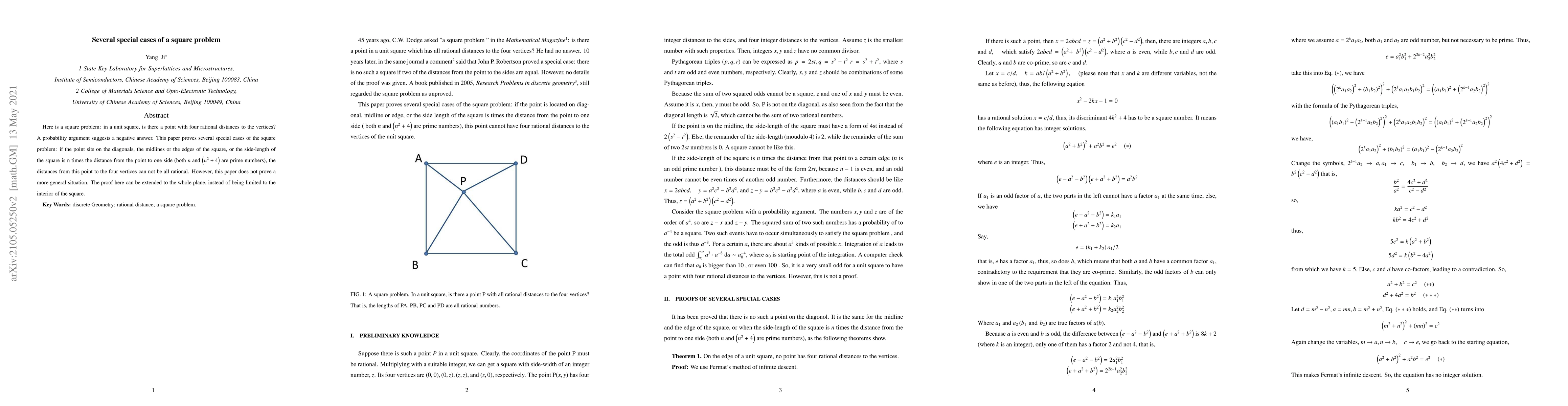 This paper proves several special cases of a square problem, showing that in certain configurations, points within a unit square cannot have four rational distances to its vertices. The proof can be extended to the whole plane.