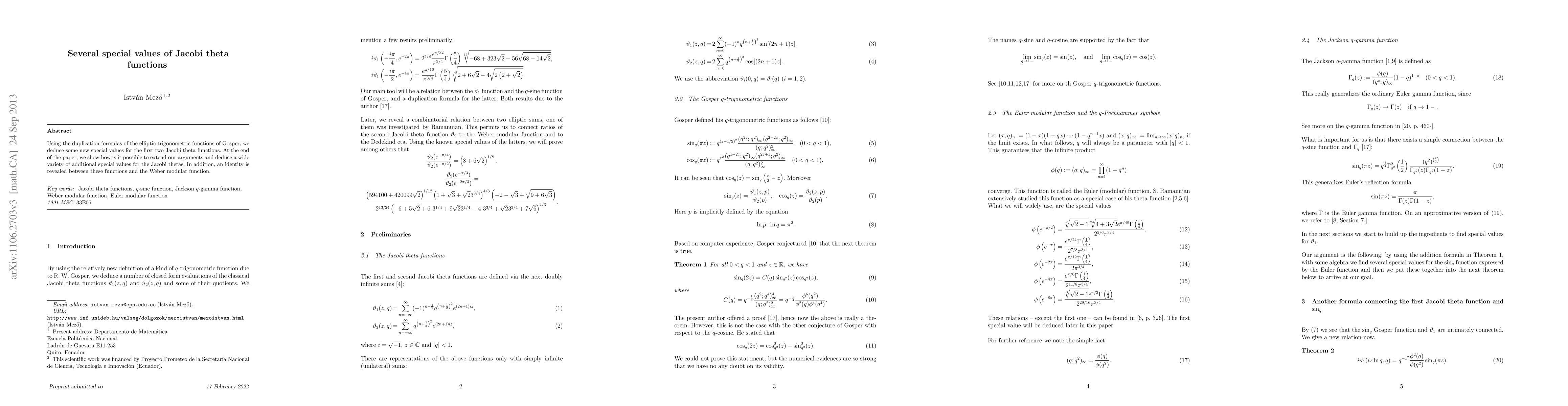 The paper derives new special values for the first two Jacobi theta functions using Gosper's elliptic trigonometric duplication formulas and extends these findings to reveal a broader range of special values. An additional identity linking these functions to the Weber modular function is also presented.