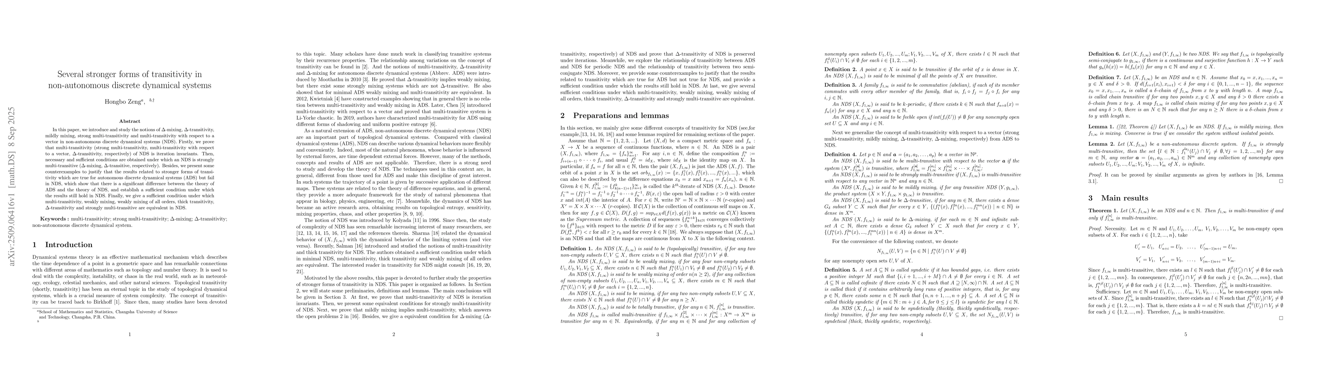 In this paper, we introduce and study the notions of $\Delta$-mixing, $\Delta$-transitivity, mildly mixing, strong multi-transitivity and multi-transitivity with respect to a vector in non-autonomous discrete dynamical systems (NDS). Firstly, we prove that multi-transitivity (strong multi-transitivity, multi-transitivity with respect to a vector, $\Delta$-transitivity, respectively) of NDS is iteration invariants. Then, necessary and sufficient conditions are obtained under which an NDS is strongly multi-transitive ($\Delta$-mixing, $\Delta$-transitive, respectively). Besides, we present some counterexamples to justify that the results related to stronger forms of transitivity which are true for autonomous discrete dynamical systems (ADS) but fail in NDS, which show that there is a significant difference between the theory of ADS and the theory of NDS, and establish a sufficient condition under which the results still hold in NDS. Finally, we give a sufficient condition under which multi-transitivity, weakly mixing, weakly mixing of all orders, thick transitivity, $\Delta$-transitivity and strongly multi-transitive are equivalent in NDS.