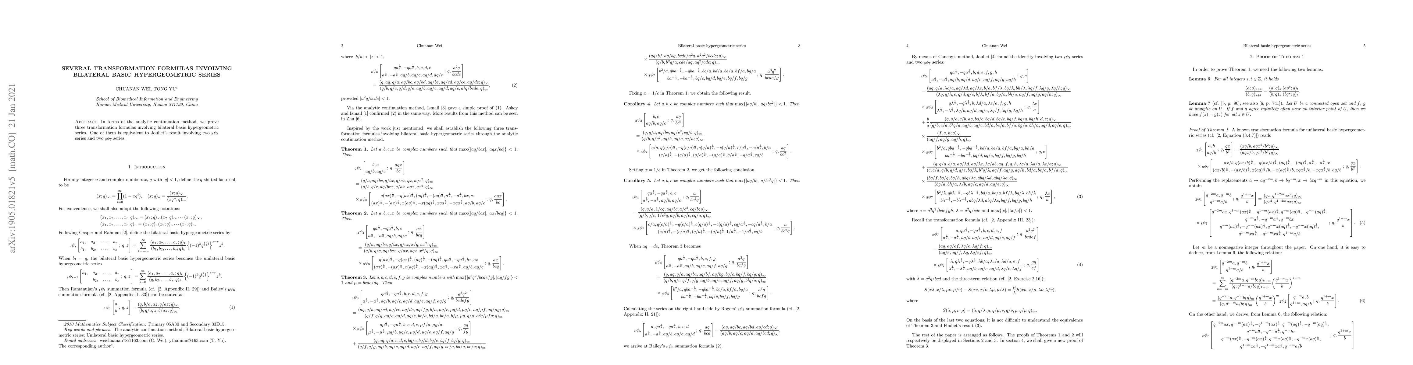 In terms of the analytic continuation method, we prove three transformation formulas involving bilateral basic hypergeometric series. One of them is equivalent to Jouhet's result involving two $_8\psi_8$ series and two $_8\phi_7$ series.