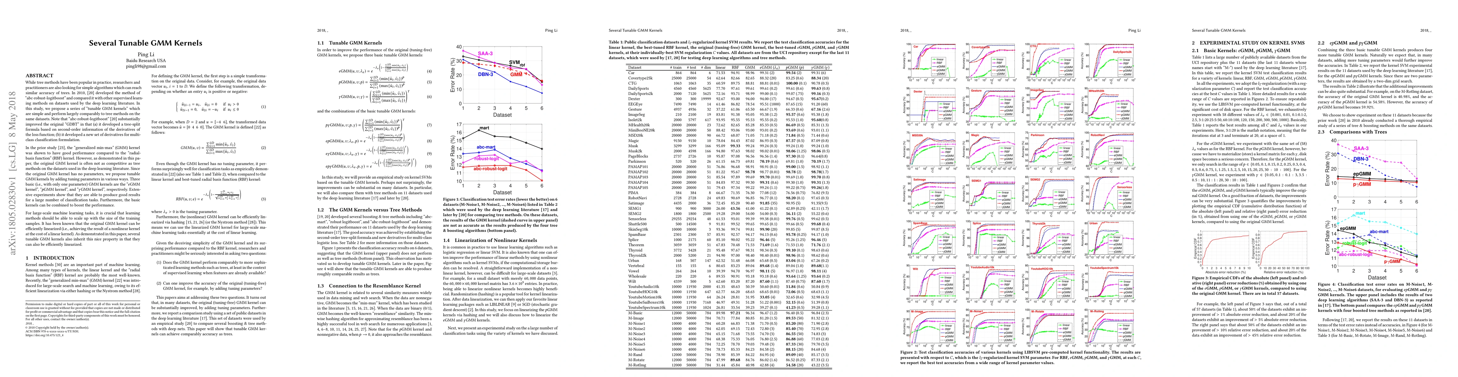 The paper introduces tunable GMM kernels ($e$GMM, $p$GMM, $\gamma$GMM) with tuning parameters, which improve upon the original GMM kernel's performance and make them competitive with tree methods.