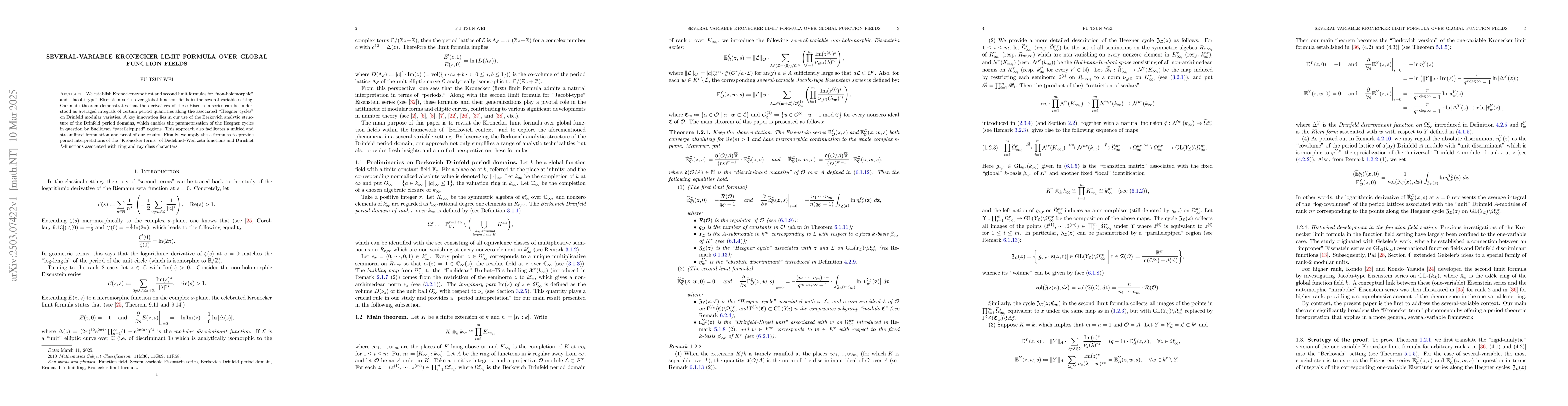 The paper establishes Kronecker-type limit formulas for non-holomorphic and Jacobi-type Eisenstein series over global function fields in the several-variable setting, utilizing the Berkovich analytic structure of Drinfeld period domains.
