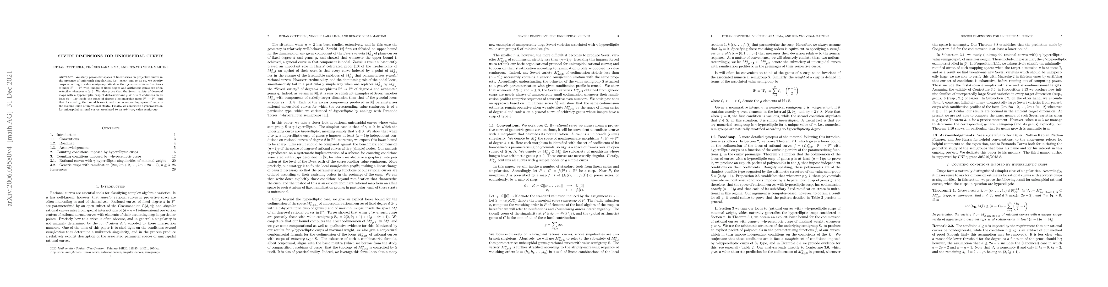 We study parameter spaces of linear series on projective curves in the presence of unibranch singularities, i.e. {\it cusps}; and to do so, we stratify cusps according to value semigroup. We show that {\it generalized Severi varieties} of maps $\mathbb{P}^1 \rightarrow \mathbb{P}^n$ with images of fixed degree and arithmetic genus are often {\it reducible} whenever $n \geq 3$. We also prove that the Severi variety of degree-$d$ maps with a hyperelliptic cusp of delta-invariant $g \ll d$ is of codimension at least $(n-1)g$ inside the space of degree-$d$ holomorphic maps $\mathbb{P}^1 \rightarrow \mathbb{P}^n$; and that for small $g$, the bound is exact, and the corresponding space of maps is the disjoint union of unirational strata. Finally, we conjecture a generalization for unicuspidal rational curves associated to an {\it arbitrary} value semigroup.