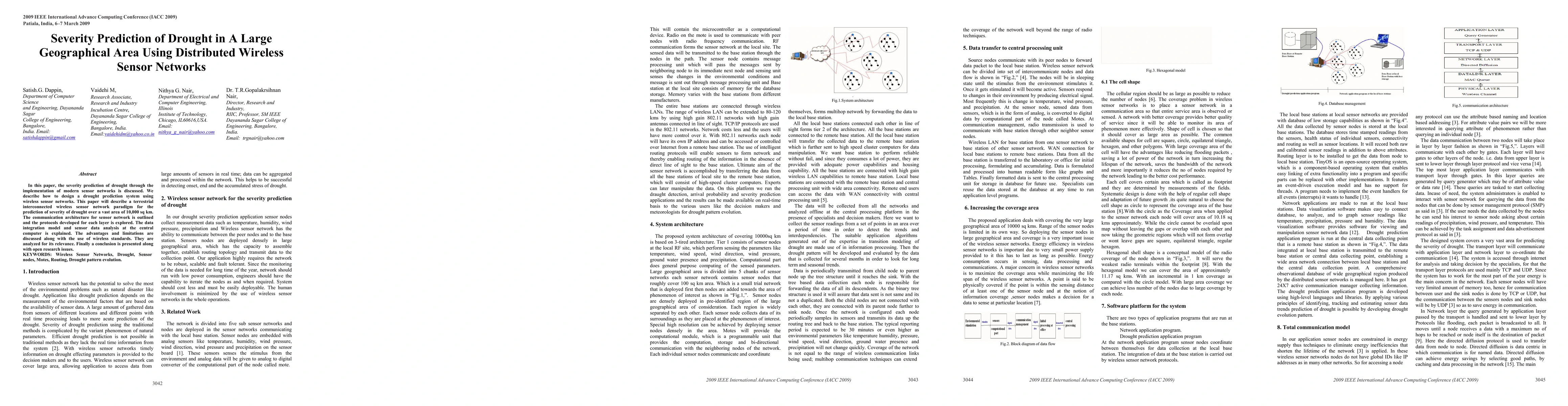 In this paper, the severity prediction of drought through the implementation of modern sensor networks is discussed. We describe how to design a drought prediction system using wireless sensor networks. This paper will describe a terrestrial interconnected wireless sensor network paradigm for the prediction of severity of drought over a vast area of 10,000 sq km. The communication architecture for sensor network is outlined and the protocols developed for each layer is explored. The data integration model and sensor data analysis at the central computer is explained. The advantages and limitations are discussed along with the use of wireless standards. They are analyzed for its relevance. Finally a conclusion is presented along with open research issues.