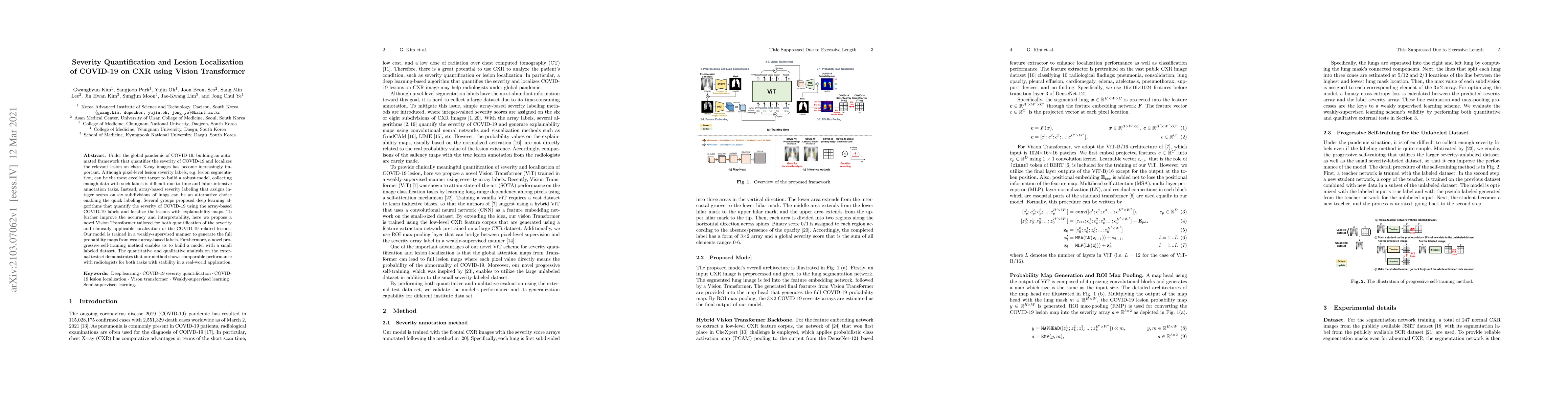Under the global pandemic of COVID-19, building an automated framework that quantifies the severity of COVID-19 and localizes the relevant lesion on chest X-ray images has become increasingly important. Although pixel-level lesion severity labels, e.g. lesion segmentation, can be the most excellent target to build a robust model, collecting enough data with such labels is difficult due to time and labor-intensive annotation tasks. Instead, array-based severity labeling that assigns integer scores on six subdivisions of lungs can be an alternative choice enabling the quick labeling. Several groups proposed deep learning algorithms that quantify the severity of COVID-19 using the array-based COVID-19 labels and localize the lesions with explainability maps. To further improve the accuracy and interpretability, here we propose a novel Vision Transformer tailored for both quantification of the severity and clinically applicable localization of the COVID-19 related lesions. Our model is trained in a weakly-supervised manner to generate the full probability maps from weak array-based labels. Furthermore, a novel progressive self-training method enables us to build a model with a small labeled dataset. The quantitative and qualitative analysis on the external testset demonstrates that our method shows comparable performance with radiologists for both tasks with stability in a real-world application.