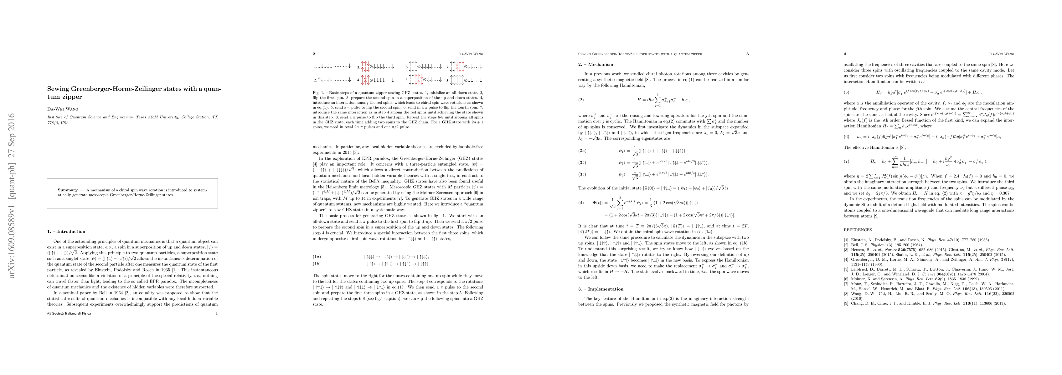 This paper presents a method using chiral spin wave rotation to construct mesoscopic Greenberger-Horne-Zeilinger (GHZ) states, referred to as a "quantum zipper" for systematically generating these quantum states.