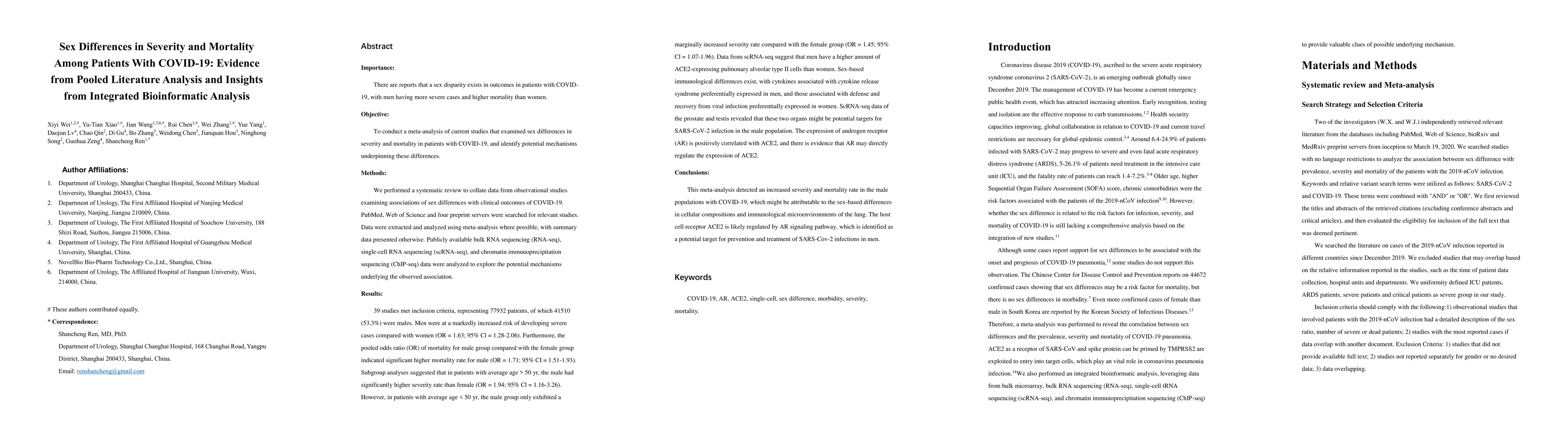 This meta-analysis reveals higher severity and mortality rates in male COVID-19 patients, likely due to greater ACE2 expression in male pulmonary alveolar type II cells and sex-based immunological differences. The androgen receptor signaling pathway regulating ACE2 expression is identified as a potential therapeutic target.