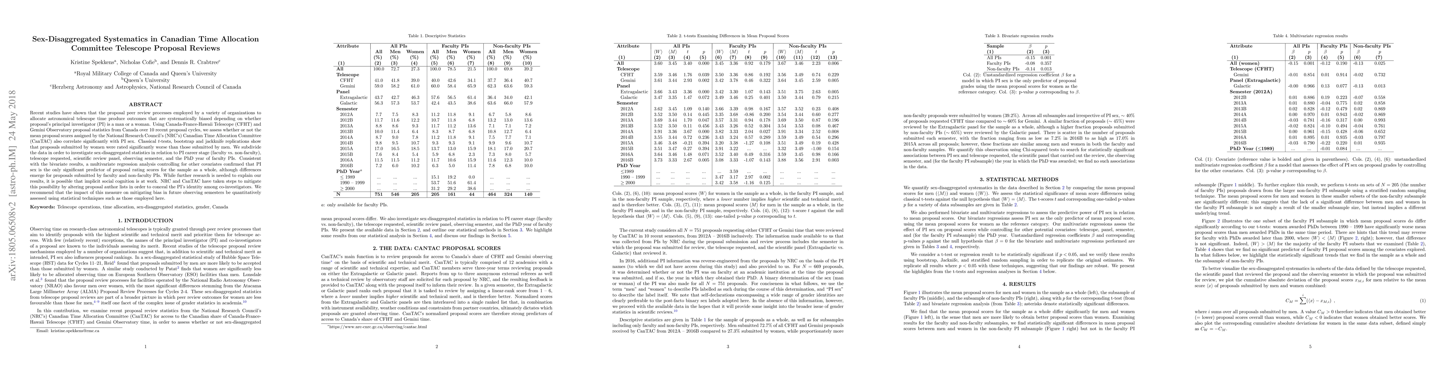 Recent studies have shown that the proposal peer review processes employed by a variety of organizations to allocate astronomical telescope time produce outcomes that are systematically biased depending on whether proposal's principal investigator (PI) is a man or a woman. Using Canada-France-Hawaii Telescope (CFHT) and Gemini Observatory proposal statistics from Canada over 10 recent proposal cycles, we assess whether or not the mean proposal scores assigned by the National Research Council's (NRC's) Canadian Time Allocation Committee (CanTAC) also correlate significantly with PI sex. Classical t-tests, bootstrap and jackknife replications show that proposals submitted by women were rated significantly worse than those submitted by men. We subdivide the data in order to investigate sex-disaggregated statistics in relation to PI career stage (faculty vs. non-faculty), telescope requested, scientific review panel, observing semester, and the PhD year of faculty PIs. Consistent with the bivariate results, a multivariate regression analysis controlling for other covariates confirmed that PI sex is the only significant predictor of proposal rating scores for the sample as a whole, although differences emerge for proposals submitted by faculty and non-faculty PIs. While further research is needed to explain our results, it is possible that implicit social cognition is at work. NRC and CanTAC have taken steps to mitigate this possibility by altering proposal author lists in order to conceal the PI's identity among co-investigators. We recommend that the impact of this measure on mitigating bias in future observing semesters be quantitatively assessed using statistical techniques such as those employed here.