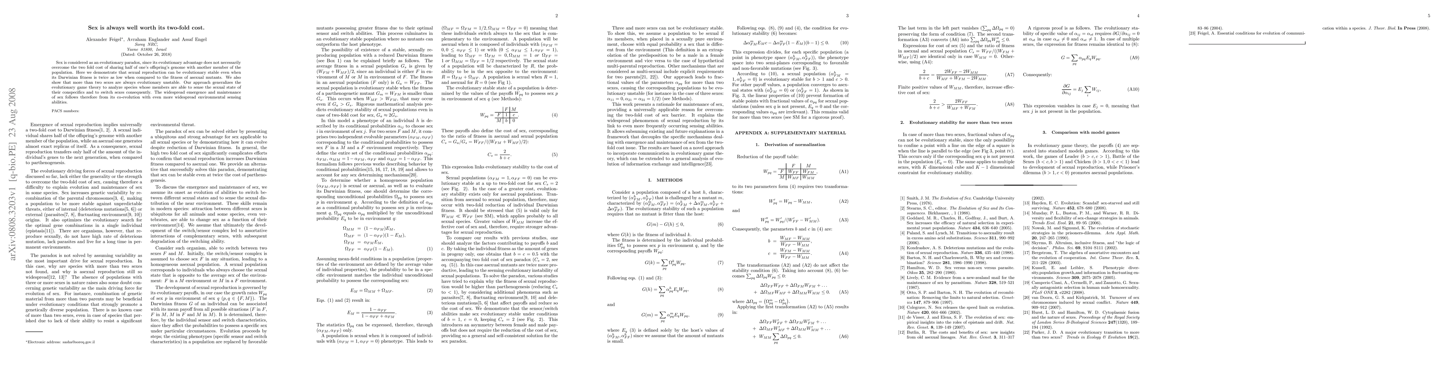 Sex is considered as an evolutionary paradox, since its evolutionary advantage does not necessarily overcome the two fold cost of sharing half of one's offspring's genome with another member of the population. Here we demonstrate that sexual reproduction can be evolutionary stable even when its Darwinian fitness is twice as low when compared to the fitness of asexual mutants. We also show that more than two sexes are always evolutionary unstable. Our approach generalizes the evolutionary game theory to analyze species whose members are able to sense the sexual state of their conspecifics and to switch sexes consequently. The widespread emergence and maintenance of sex follows therefore from its co-evolution with even more widespread environmental sensing abilities.