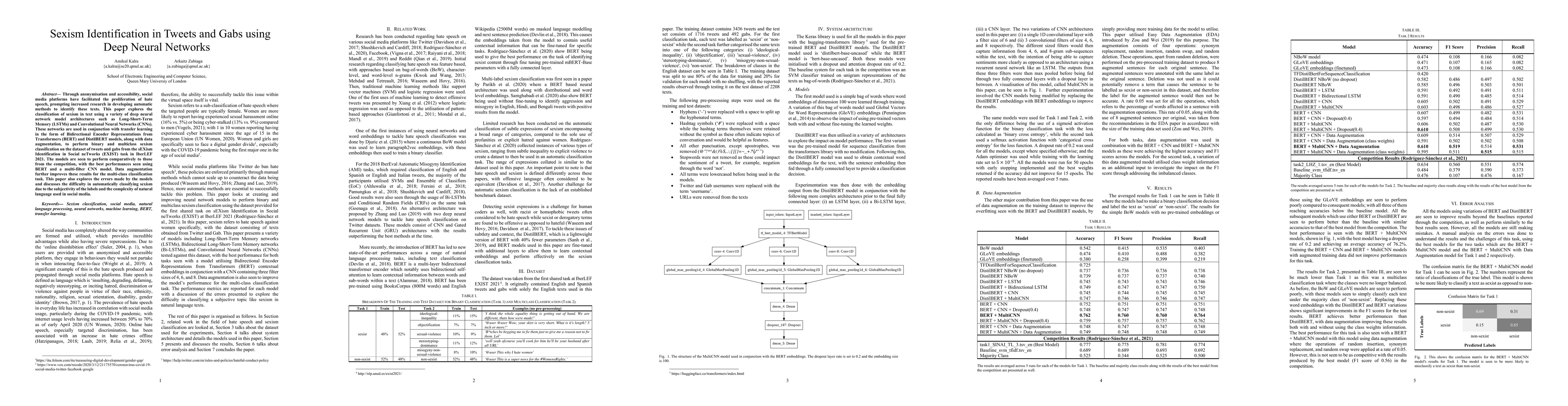 This research investigates the use of deep neural networks, including LSTMs, CNNs, BERT, and DistilBERT, to classify sexism in social media texts. The study employs data augmentation and transfer learning to improve model performance on the EXIST dataset, achieving competitive results in both binary and multiclass classification tasks. The paper also highlights the challenges of accurately identifying sexism due to its subjective nature and the complexity of social media language.