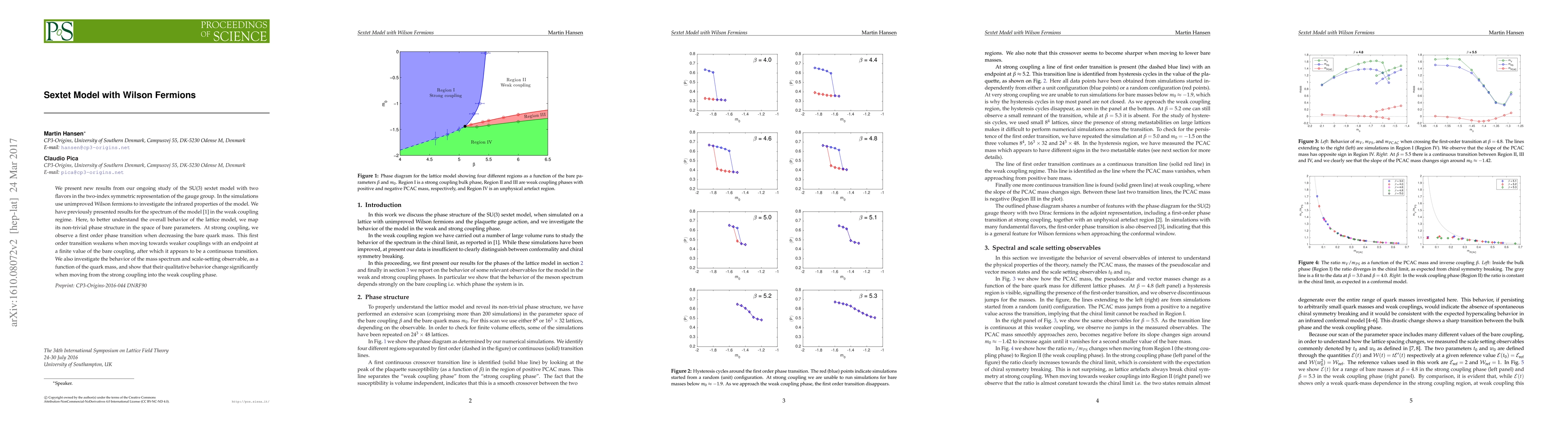We present new results from our ongoing study of the SU(3) sextet model with two flavors in the two-index symmetric representation of the gauge group. In the simulations use unimproved Wilson fermions to investigate the infrared properties of the model. We have previously presented results for the spectrum of the model in the weak coupling regime. Here, to better understand the overall behavior of the lattice model, we map its non-trivial phase structure in the space of bare parameters. At strong coupling, we observe a first order phase transition when decreasing the bare quark mass. This first order transition weakens when moving towards weaker couplings with an endpoint at a finite value of the bare coupling, after which it appears to be a continuous transition. We also investigate the behavior of the mass spectrum and scale-setting observable, as a function of the quark mass, and show that their qualitative behavior change significantly when moving from the strong coupling into the weak coupling phase.