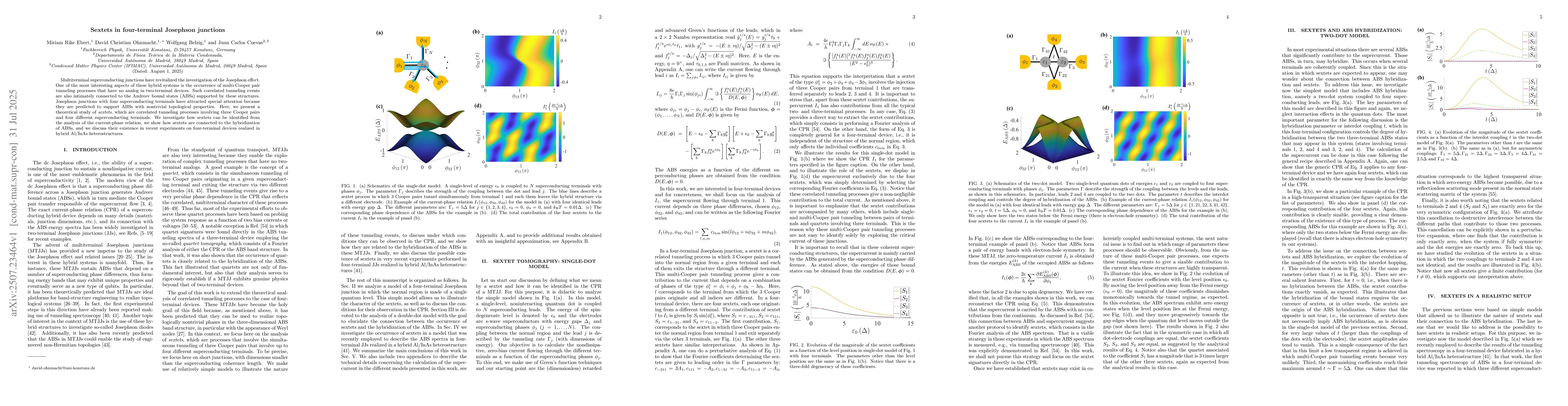 Multiterminal superconducting junctions have revitalized the investigation of the Josephson effect. One of the most interesting aspects of these hybrid systems is the occurrence of multi-Cooper pair tunneling processes that have no analog in two-terminal devices. Such correlated tunneling events are also intimately connected to the Andreev bound states (ABSs) supported by these structures. Josephson junctions with four superconducting terminals have attracted special attention because they are predicted to support ABSs with nontrivial topological properties. Here, we present a theoretical study of sextets, which are correlated tunneling processes involving three Cooper pairs and four different superconducting terminals. We investigate how sextets can be identified from the analysis of the current-phase relation, we show how sextets are connected to the hybridization of ABSs, and we discuss their existence in recent experiments on four-terminal devices realized in hybrid Al/InAs heterostructures.