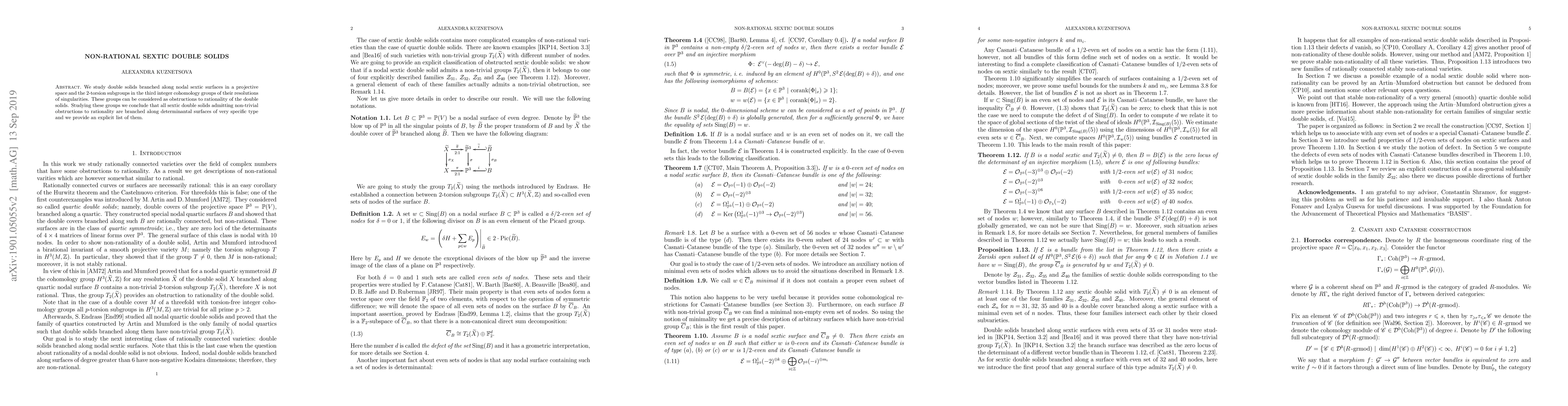 We study a double solid X branched along a nodal sextic surface in a projective space and the 2-torsion subgroup in the third integer cohomology group of a resolution of singularities of X. This group can be considered as an obstruction to rationality of X. Studying this group we conclude that all sextic double solids admitting non-trivial obstructions to rationality are branched along determinantal surfaces of very specific type and we provide an explicit list of them.