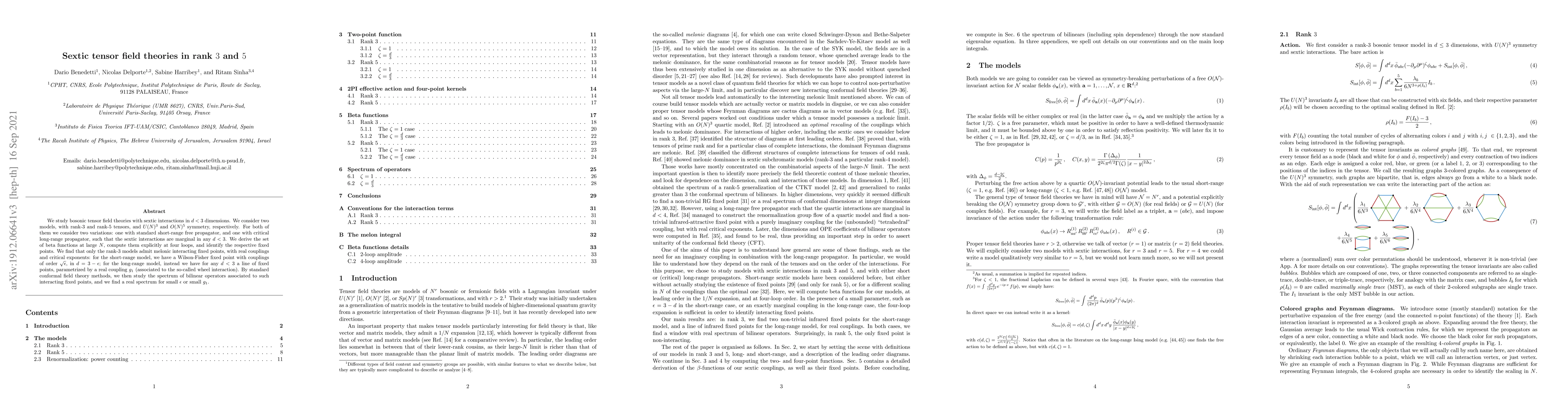 We study bosonic tensor field theories with sextic interactions in $d<3$ dimensions. We consider two models, with rank-3 and rank-5 tensors, and $U(N)^3$ and $O(N)^5$ symmetry, respectively. For both of them we consider two variations: one with standard short-range free propagator, and one with critical long-range propagator, such that the sextic interactions are marginal in any $d<3$. We derive the set of beta functions at large $N$, compute them explicitly at four loops, and identify the respective fixed points. We find that only the rank-3 models admit a melonic interacting fixed points, with real couplings and critical exponents: for the short-range model, we have a Wilson-Fisher fixed point with couplings of order $\sqrt{\epsilon}$, in $d=3-\epsilon$; for the long-range model, instead we have for any $d<3$ a line of fixed points, parametrized by a real coupling $g_1$ (associated to the so-called wheel interaction). By standard conformal field theory methods, we then study the spectrum of bilinear operators associated to such interacting fixed points, and we find a real spectrum for small $\epsilon$ or small $g_1$.