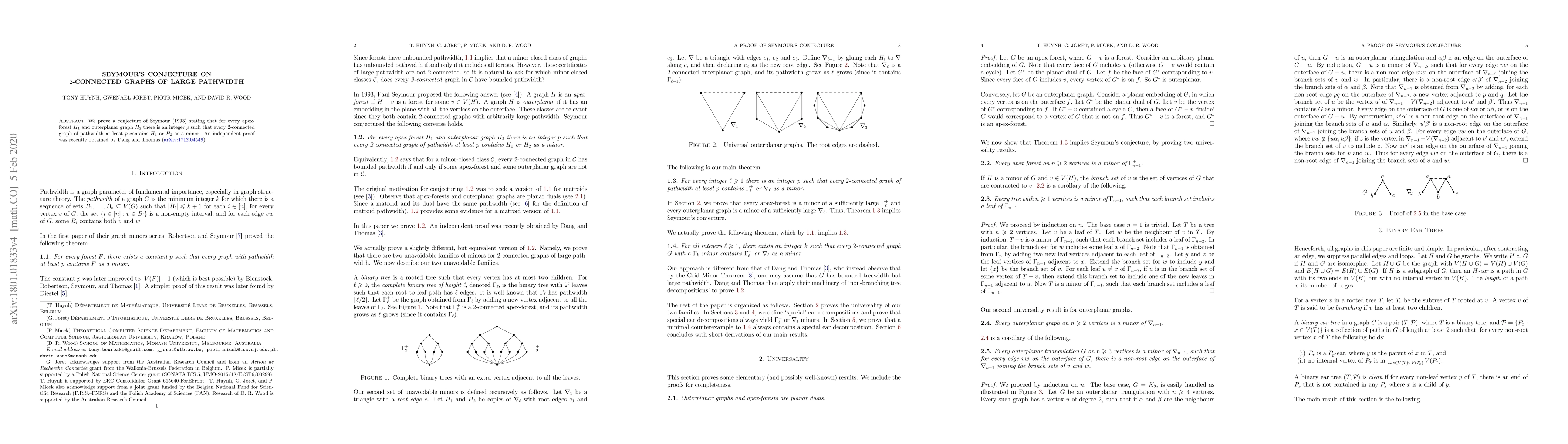 This paper proves Seymour's 1993 conjecture that for any apex-forest $H_1$ and outerplanar graph $H_2$, there exists a pathwidth threshold $p$ such that every 2-connected graph with pathwidth greater than $p$ contains either $H_1$ or $H_2$ as a minor. An independent proof was also recently provided by Dang and Thomas.