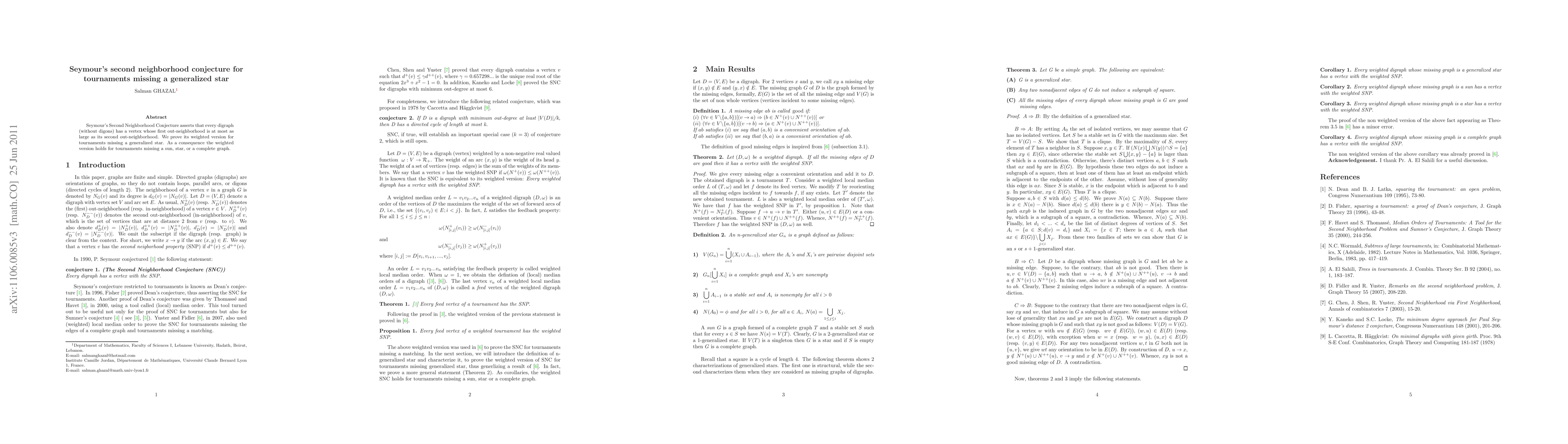 Summary: This paper proves the weighted version of Seymour's Second Neighborhood Conjecture for tournaments that lack a generalized star. It follows that the conjecture also holds for tournaments missing a sun, star, or a complete graph.