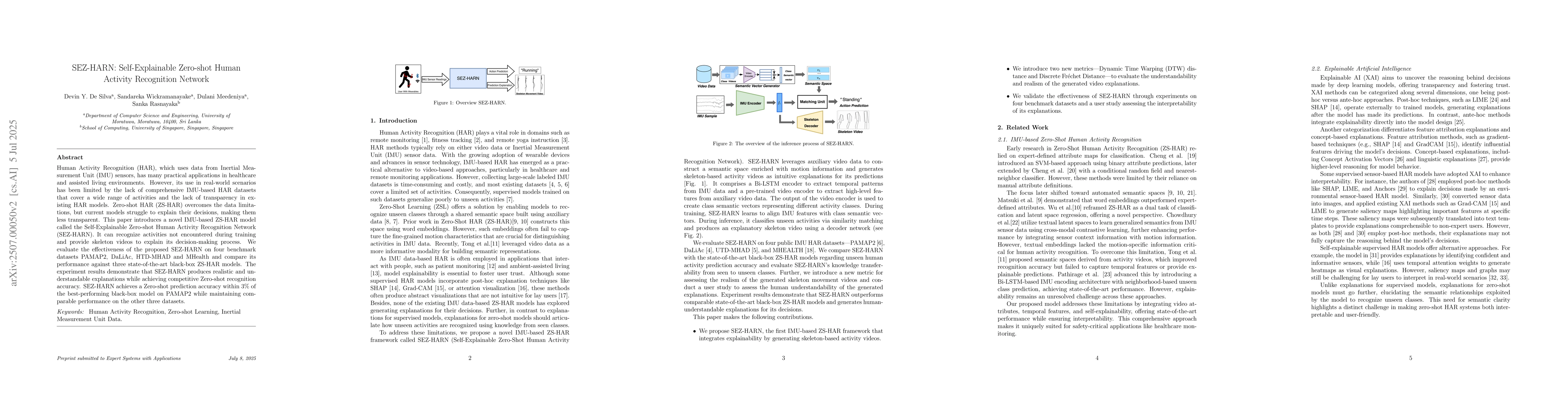 Human Activity Recognition (HAR), which uses data from Inertial Measurement Unit (IMU) sensors, has many practical applications in healthcare and assisted living environments. However, its use in real-world scenarios has been limited by the lack of comprehensive IMU-based HAR datasets that cover a wide range of activities and the lack of transparency in existing HAR models. Zero-shot HAR (ZS-HAR) overcomes the data limitations, but current models struggle to explain their decisions, making them less transparent. This paper introduces a novel IMU-based ZS-HAR model called the Self-Explainable Zero-shot Human Activity Recognition Network (SEZ-HARN). It can recognize activities not encountered during training and provide skeleton videos to explain its decision-making process. We evaluate the effectiveness of the proposed SEZ-HARN on four benchmark datasets PAMAP2, DaLiAc, HTD-MHAD and MHealth and compare its performance against three state-of-the-art black-box ZS-HAR models. The experiment results demonstrate that SEZ-HARN produces realistic and understandable explanations while achieving competitive Zero-shot recognition accuracy. SEZ-HARN achieves a Zero-shot prediction accuracy within 3\% of the best-performing black-box model on PAMAP2 while maintaining comparable performance on the other three datasets.