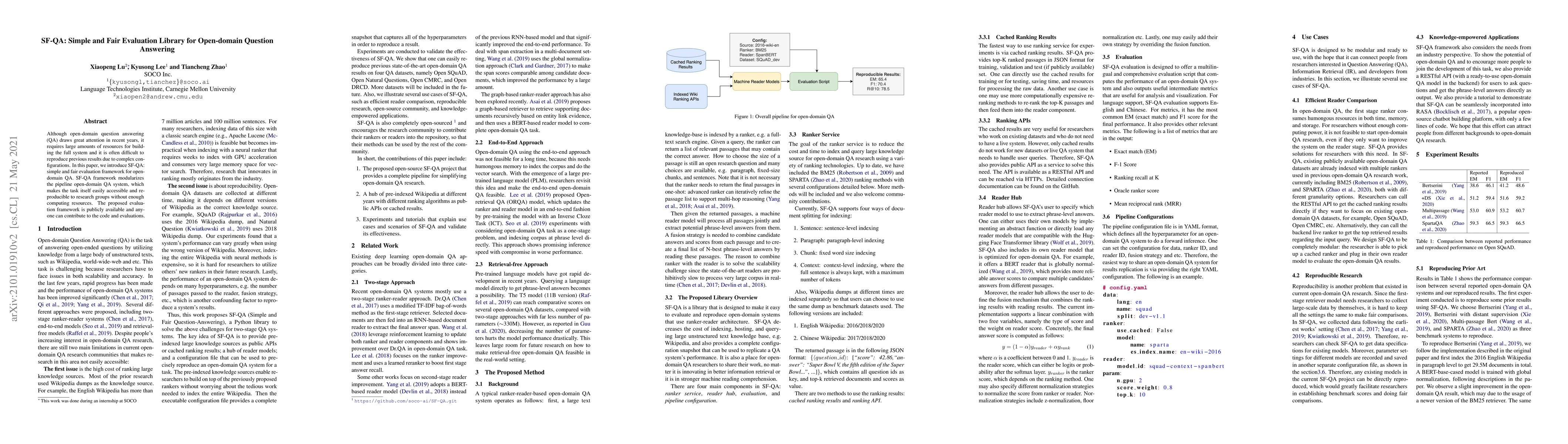 This paper introduces SF-QA, a simple and fair evaluation framework for open-domain question answering, aiming to make the task accessible and reproducible for research groups. SF-QA modularizes the QA system pipeline and is publicly available for contributions.