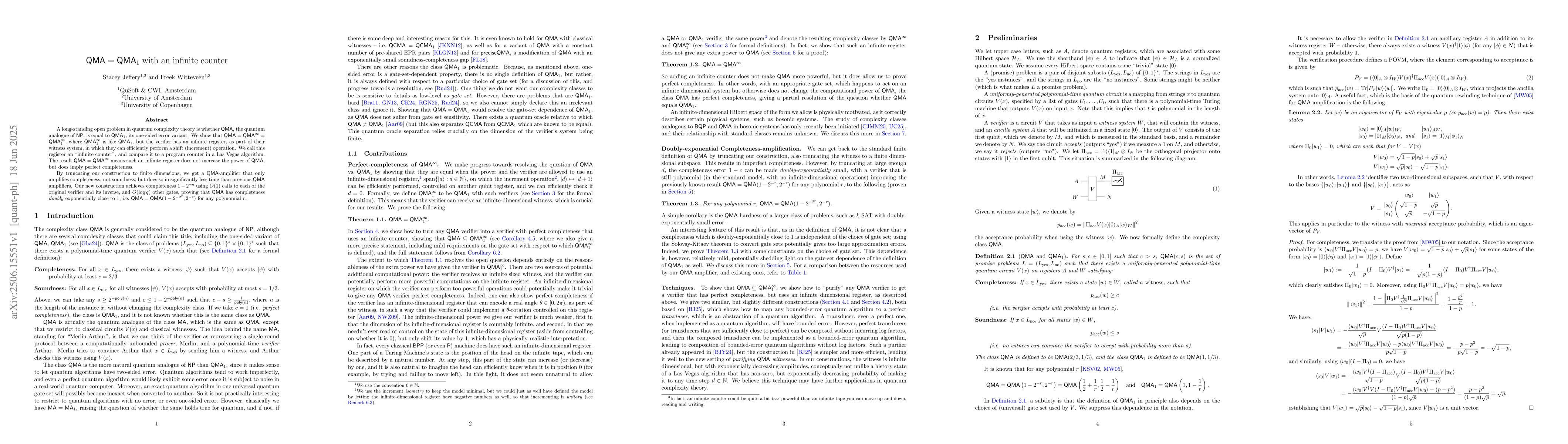 A long-standing open problem in quantum complexity theory is whether ${\sf QMA}$, the quantum analogue of ${\sf NP}$, is equal to ${\sf QMA}_1$, its one-sided error variant. We show that ${\sf QMA}={\sf QMA}^{\infty}= {\sf QMA}_1^{\infty}$, where ${\sf QMA}_1^\infty$ is like ${\sf QMA}_1$, but the verifier has an infinite register, as part of their witness system, in which they can efficiently perform a shift (increment) operation. We call this register an ``infinite counter'', and compare it to a program counter in a Las Vegas algorithm. The result ${\sf QMA}={\sf QMA}^\infty$ means such an infinite register does not increase the power of ${\sf QMA}$, but does imply perfect completeness. By truncating our construction to finite dimensions, we get a ${\sf QMA}$-amplifier that only amplifies completeness, not soundness, but does so in significantly less time than previous ${\sf QMA}$ amplifiers. Our new construction achieves completeness $1-2^{-q}$ using $O(1)$ calls to each of the original verifier and its inverse, and $O(\log q)$ other gates, proving that ${\sf QMA}$ has completeness doubly exponentially close to 1, i.e. ${\sf QMA}={\sf QMA}(1-2^{-2^r},2^{-r})$ for any polynomial $r$.