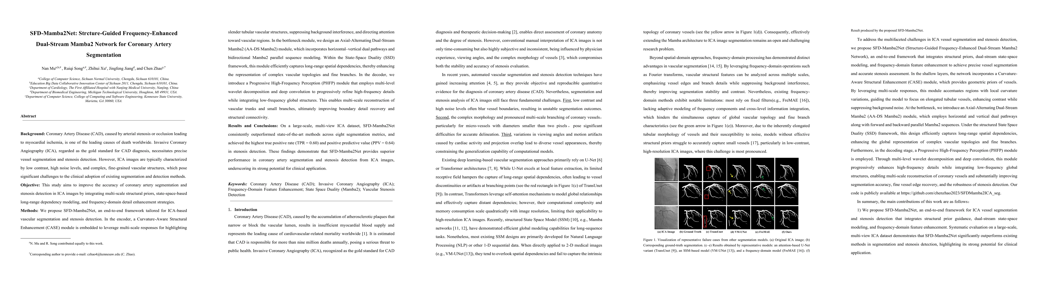 Background: Coronary Artery Disease (CAD) is one of the leading causes of death worldwide. Invasive Coronary Angiography (ICA), regarded as the gold standard for CAD diagnosis, necessitates precise vessel segmentation and stenosis detection. However, ICA images are typically characterized by low contrast, high noise levels, and complex, fine-grained vascular structures, which pose significant challenges to the clinical adoption of existing segmentation and detection methods. Objective: This study aims to improve the accuracy of coronary artery segmentation and stenosis detection in ICA images by integrating multi-scale structural priors, state-space-based long-range dependency modeling, and frequency-domain detail enhancement strategies. Methods: We propose SFD-Mamba2Net, an end-to-end framework tailored for ICA-based vascular segmentation and stenosis detection. In the encoder, a Curvature-Aware Structural Enhancement (CASE) module is embedded to leverage multi-scale responses for highlighting slender tubular vascular structures, suppressing background interference, and directing attention toward vascular regions. In the decoder, we introduce a Progressive High-Frequency Perception (PHFP) module that employs multi-level wavelet decomposition to progressively refine high-frequency details while integrating low-frequency global structures. Results and Conclusions: SFD-Mamba2Net consistently outperformed state-of-the-art methods across eight segmentation metrics, and achieved the highest true positive rate and positive predictive value in stenosis detection.