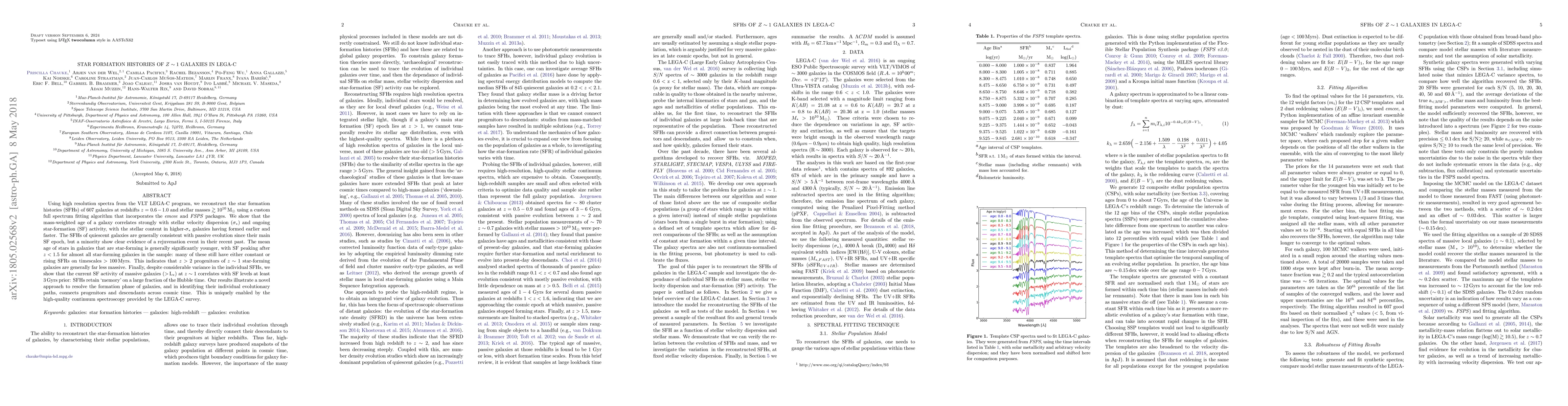 Using high resolution spectra from the VLT LEGA-C program, we reconstruct the star formation histories (SFHs) of 607 galaxies at redshifts $z = 0.6-1.0$ and stellar masses $\gtrsim10^{10}$M$_{\odot}$ using a custom full spectrum fitting algorithm that incorporates the emcee and FSPS packages. We show that the mass-weighted age of a galaxy correlates strongly with stellar velocity dispersion ($\sigma_*$) and ongoing star-formation (SF) activity, with the stellar content in higher-$\sigma_*$ galaxies having formed earlier and faster. The SFHs of quiescent galaxies are generally consistent with passive evolution since their main SF epoch, but a minority show clear evidence of a rejuvenation event in their recent past. The mean age of stars in galaxies that are star-forming is generally significantly younger, with SF peaking after $z<1.5$ for almost all star-forming galaxies in the sample: many of these still have either constant or rising SFRs on timescales $>100$Myrs. This indicates that $z>2$ progenitors of $z\sim1$ star-forming galaxies are generally far less massive. Finally, despite considerable variance in the individual SFHs, we show that the current SF activity of massive galaxies ($>$L$_*$) at $z\sim1$ correlates with SF levels at least $3$Gyrs prior: SFHs retain `memory' on a large fraction of the Hubble time. Our results illustrate a novel approach to resolve the formation phase of galaxies, and in identifying their individual evolutionary paths, connects progenitors and descendants across cosmic time. This is uniquely enabled by the high-quality continuum spectroscopy provided by the LEGA-C survey.