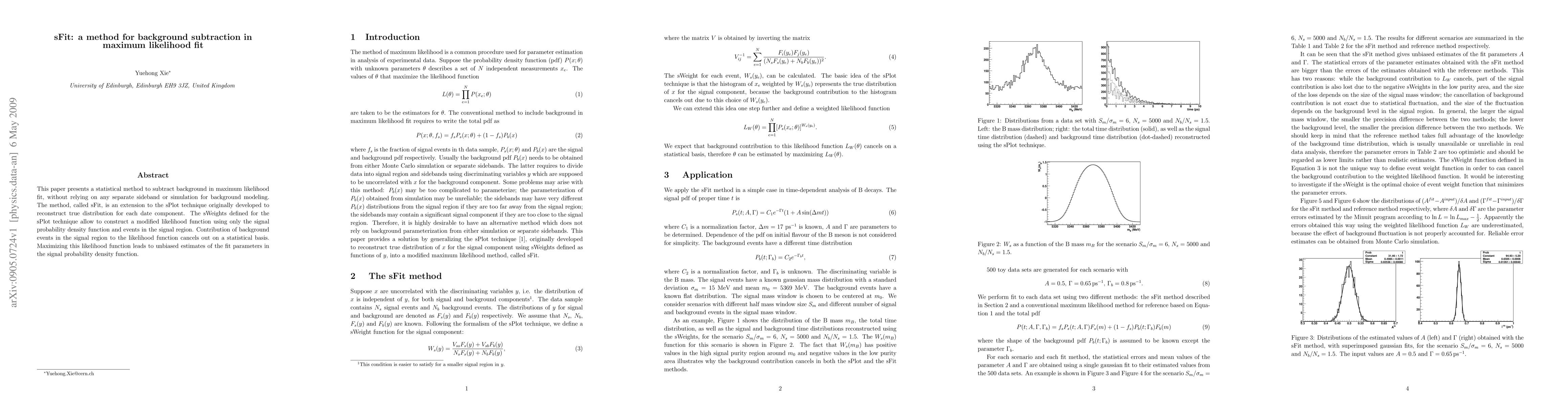 This paper presents a statistical method to subtract background in maximum likelihood fit, without relying on any separate sideband or simulation for background modeling. The method, called sFit, is an extension to the sPlot technique originally developed to reconstruct true distribution for each date component. The sWeights defined for the sPlot technique allow to construct a modified likelihood function using only the signal probability density function and events in the signal region. Contribution of background events in the signal region to the likelihood function cancels out on a statistical basis. Maximizing this likelihood function leads to unbiased estimates of the fit parameters in the signal probability density function.