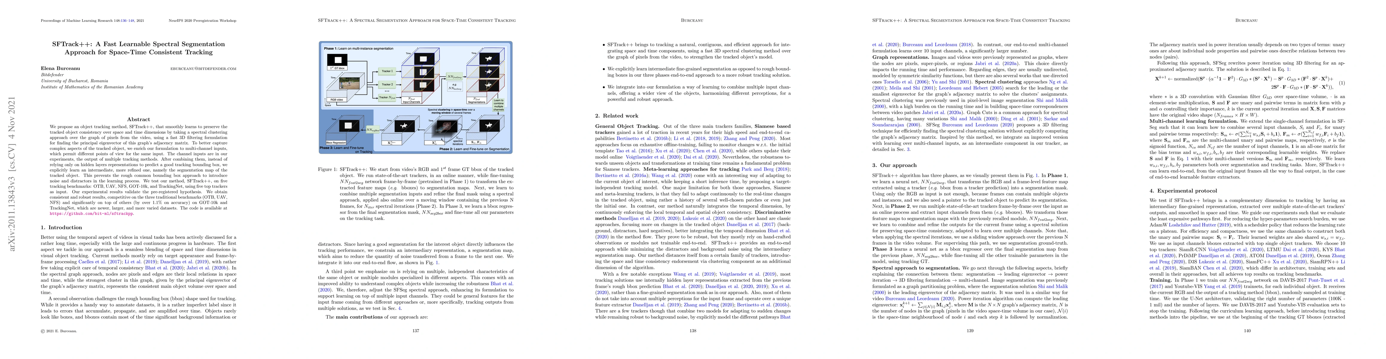 We propose an object tracking method, SFTrack++, that smoothly learns to preserve the tracked object consistency over space and time dimensions by taking a spectral clustering approach over the graph of pixels from the video, using a fast 3D filtering formulation for finding the principal eigenvector of this graph's adjacency matrix. To better capture complex aspects of the tracked object, we enrich our formulation to multi-channel inputs, which permit different points of view for the same input. The channel inputs are in our experiments, the output of multiple tracking methods. After combining them, instead of relying only on hidden layers representations to predict a good tracking bounding box, we explicitly learn an intermediate, more refined one, namely the segmentation map of the tracked object. This prevents the rough common bounding box approach to introduce noise and distractors in the learning process. We test our method, SFTrack++, on five tracking benchmarks: OTB, UAV, NFS, GOT-10k, and TrackingNet, using five top trackers as input. Our experimental results validate the pre-registered hypothesis. We obtain consistent and robust results, competitive on the three traditional benchmarks (OTB, UAV, NFS) and significantly on top of others (by over $1.1\%$ on accuracy) on GOT-10k and TrackingNet, which are newer, larger, and more varied datasets.