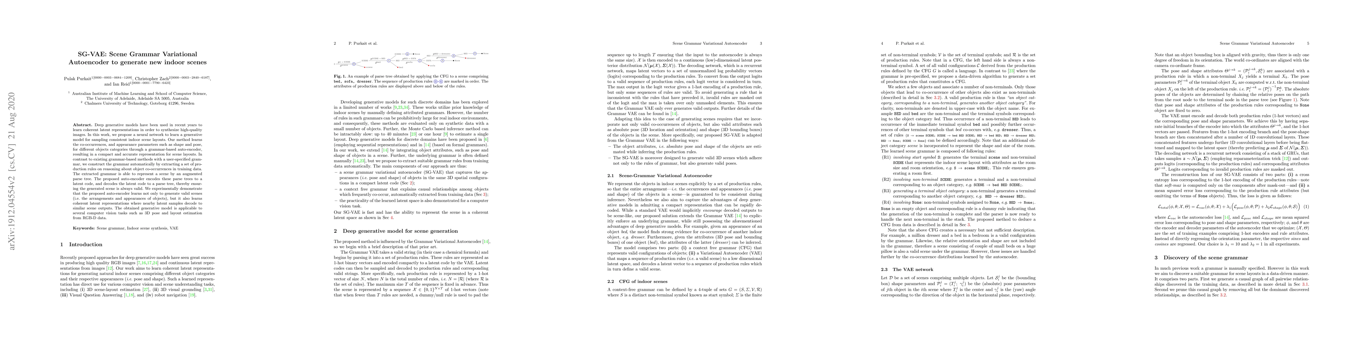 Deep generative models have been used in recent years to learn coherent latent representations in order to synthesize high-quality images. In this work, we propose a neural network to learn a generative model for sampling consistent indoor scene layouts. Our method learns the co-occurrences, and appearance parameters such as shape and pose, for different objects categories through a grammar-based auto-encoder, resulting in a compact and accurate representation for scene layouts. In contrast to existing grammar-based methods with a user-specified grammar, we construct the grammar automatically by extracting a set of production rules on reasoning about object co-occurrences in training data. The extracted grammar is able to represent a scene by an augmented parse tree. The proposed auto-encoder encodes these parse trees to a latent code, and decodes the latent code to a parse tree, thereby ensuring the generated scene is always valid. We experimentally demonstrate that the proposed auto-encoder learns not only to generate valid scenes (i.e. the arrangements and appearances of objects), but it also learns coherent latent representations where nearby latent samples decode to similar scene outputs. The obtained generative model is applicable to several computer vision tasks such as 3D pose and layout estimation from RGB-D data.