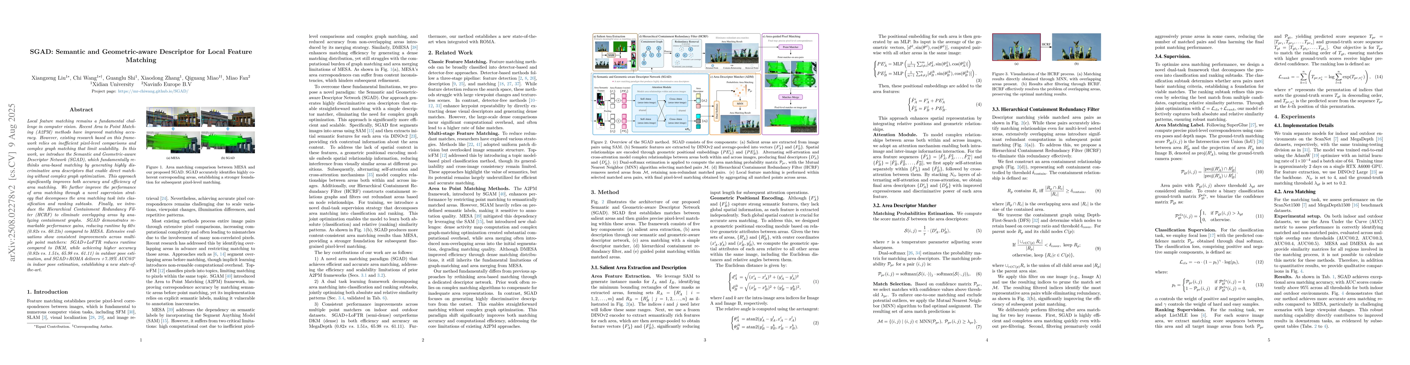 Local feature matching remains a fundamental challenge in computer vision. Recent Area to Point Matching (A2PM) methods have improved matching accuracy. However, existing research based on this framework relies on inefficient pixel-level comparisons and complex graph matching that limit scalability. In this work, we introduce the Semantic and Geometric-aware Descriptor Network (SGAD), which fundamentally rethinks area-based matching by generating highly discriminative area descriptors that enable direct matching without complex graph optimization. This approach significantly improves both accuracy and efficiency of area matching. We further improve the performance of area matching through a novel supervision strategy that decomposes the area matching task into classification and ranking subtasks. Finally, we introduce the Hierarchical Containment Redundancy Filter (HCRF) to eliminate overlapping areas by analyzing containment graphs. SGAD demonstrates remarkable performance gains, reducing runtime by 60x (0.82s vs. 60.23s) compared to MESA. Extensive evaluations show consistent improvements across multiple point matchers: SGAD+LoFTR reduces runtime compared to DKM, while achieving higher accuracy (0.82s vs. 1.51s, 65.98 vs. 61.11) in outdoor pose estimation, and SGAD+ROMA delivers +7.39% AUC@5{\deg} in indoor pose estimation, establishing a new state-of-the-art.
