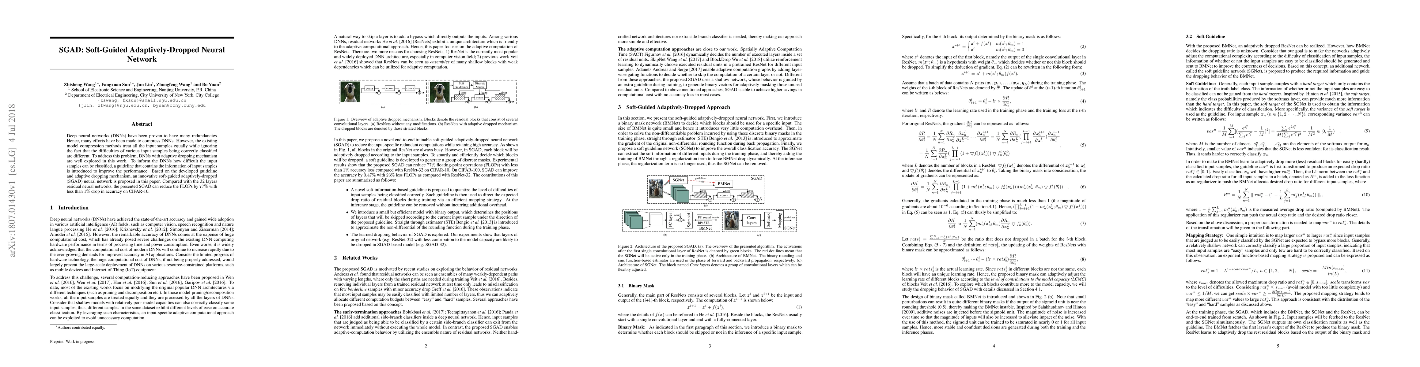 Deep neural networks (DNNs) have been proven to have many redundancies. Hence, many efforts have been made to compress DNNs. However, the existing model compression methods treat all the input samples equally while ignoring the fact that the difficulties of various input samples being correctly classified are different. To address this problem, DNNs with adaptive dropping mechanism are well explored in this work. To inform the DNNs how difficult the input samples can be classified, a guideline that contains the information of input samples is introduced to improve the performance. Based on the developed guideline and adaptive dropping mechanism, an innovative soft-guided adaptively-dropped (SGAD) neural network is proposed in this paper. Compared with the 32 layers residual neural networks, the presented SGAD can reduce the FLOPs by 77% with less than 1% drop in accuracy on CIFAR-10.