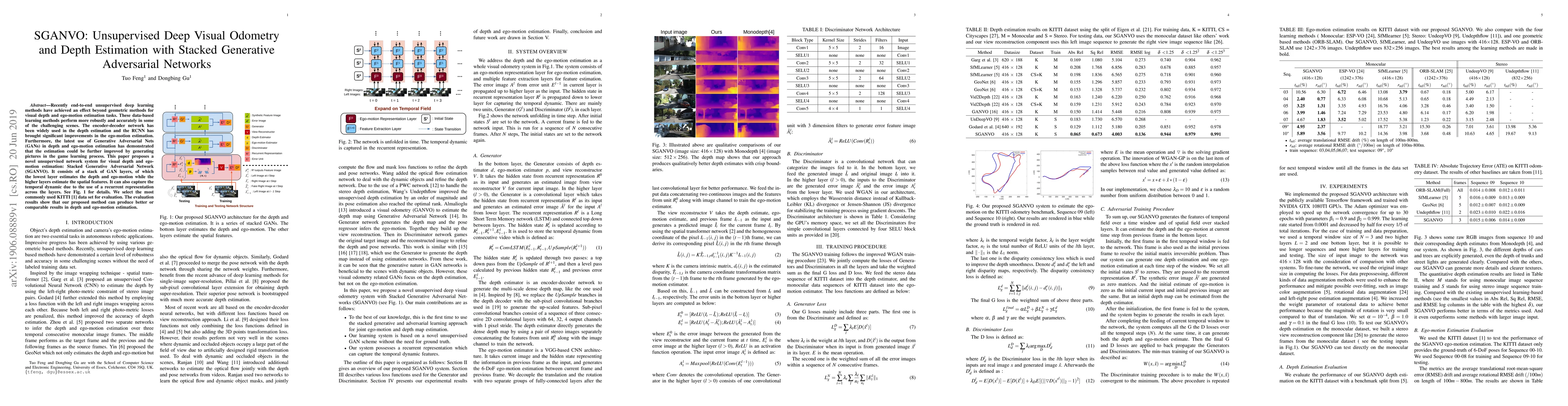 This paper introduces SGANVO, an unsupervised deep learning network system using stacked Generative Adversarial Networks (GANs) for visual depth and ego-motion estimation, showing improved accuracy over traditional methods on the KITTI dataset. The proposed method leverages an encoder-decoder architecture and recurrent representations to capture spatial and temporal dynamics.