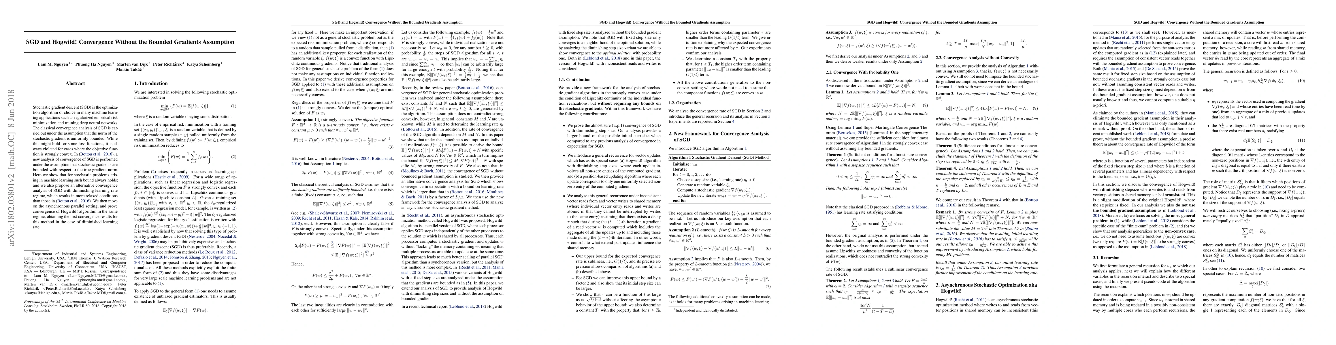 Stochastic gradient descent (SGD) is the optimization algorithm of choice in many machine learning applications such as regularized empirical risk minimization and training deep neural networks. The classical convergence analysis of SGD is carried out under the assumption that the norm of the stochastic gradient is uniformly bounded. While this might hold for some loss functions, it is always violated for cases where the objective function is strongly convex. In (Bottou et al.,2016), a new analysis of convergence of SGD is performed under the assumption that stochastic gradients are bounded with respect to the true gradient norm. Here we show that for stochastic problems arising in machine learning such bound always holds; and we also propose an alternative convergence analysis of SGD with diminishing learning rate regime, which results in more relaxed conditions than those in (Bottou et al.,2016). We then move on the asynchronous parallel setting, and prove convergence of Hogwild! algorithm in the same regime, obtaining the first convergence results for this method in the case of diminished learning rate.