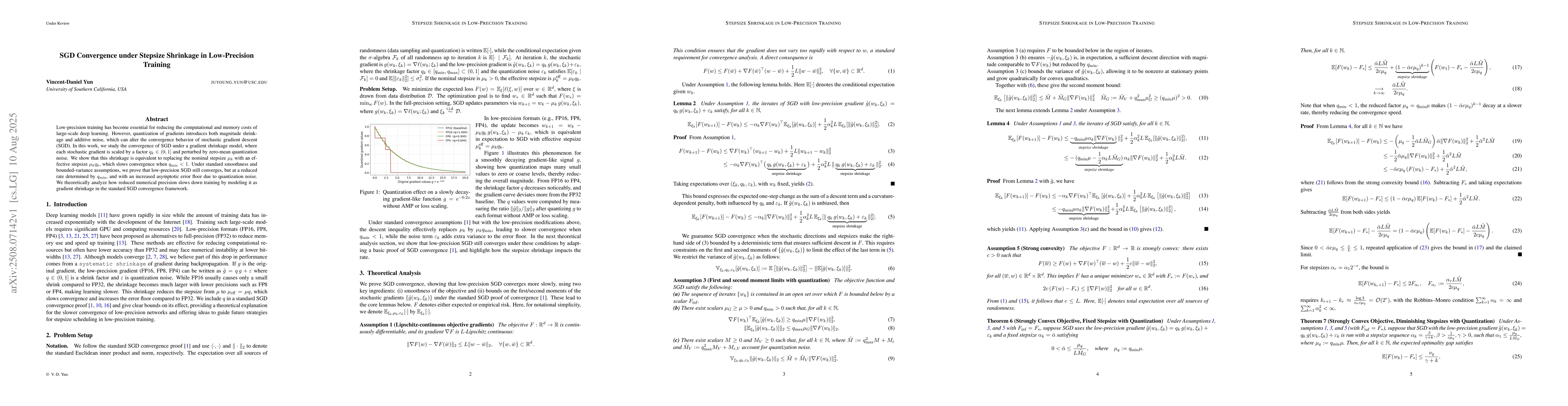 The paper studies the convergence of SGD under a gradient shrinkage model in low-precision training, where stochastic gradients are scaled by a factor $q_k \in (0,1]$ and perturbed by zero-mean quantization noise, effectively replacing the nominal stepsize $\mu_k$ with an effective stepsize $\mu_k q_k$.