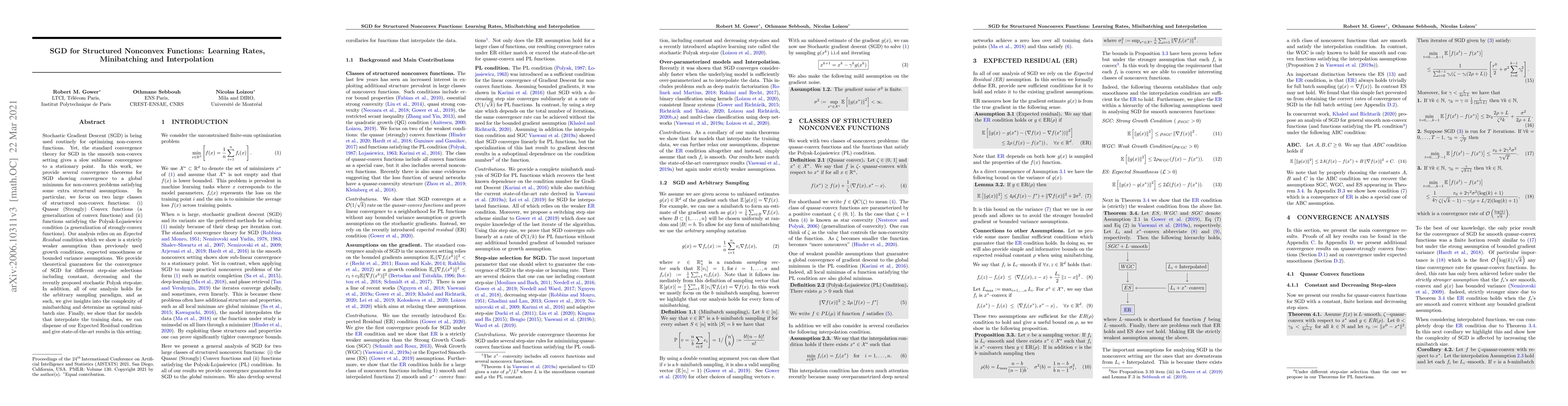Stochastic Gradient Descent (SGD) is being used routinely for optimizing non-convex functions. Yet, the standard convergence theory for SGD in the smooth non-convex setting gives a slow sublinear convergence to a stationary point. In this work, we provide several convergence theorems for SGD showing convergence to a global minimum for non-convex problems satisfying some extra structural assumptions. In particular, we focus on two large classes of structured non-convex functions: (i) Quasar (Strongly) Convex functions (a generalization of convex functions) and (ii) functions satisfying the Polyak-Lojasiewicz condition (a generalization of strongly-convex functions). Our analysis relies on an Expected Residual condition which we show is a strictly weaker assumption than previously used growth conditions, expected smoothness or bounded variance assumptions. We provide theoretical guarantees for the convergence of SGD for different step-size selections including constant, decreasing and the recently proposed stochastic Polyak step-size. In addition, all of our analysis holds for the arbitrary sampling paradigm, and as such, we give insights into the complexity of minibatching and determine an optimal minibatch size. Finally, we show that for models that interpolate the training data, we can dispense of our Expected Residual condition and give state-of-the-art results in this setting.