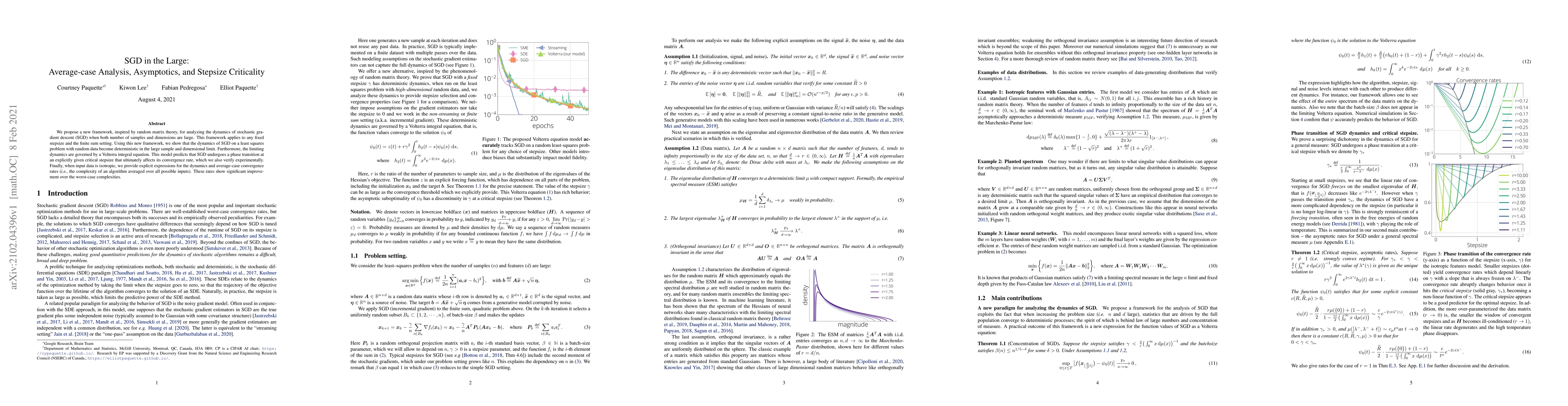 We propose a new framework, inspired by random matrix theory, for analyzing the dynamics of stochastic gradient descent (SGD) when both number of samples and dimensions are large. This framework applies to any fixed stepsize and the finite sum setting. Using this new framework, we show that the dynamics of SGD on a least squares problem with random data become deterministic in the large sample and dimensional limit. Furthermore, the limiting dynamics are governed by a Volterra integral equation. This model predicts that SGD undergoes a phase transition at an explicitly given critical stepsize that ultimately affects its convergence rate, which we also verify experimentally. Finally, when input data is isotropic, we provide explicit expressions for the dynamics and average-case convergence rates (i.e., the complexity of an algorithm averaged over all possible inputs). These rates show significant improvement over the worst-case complexities.