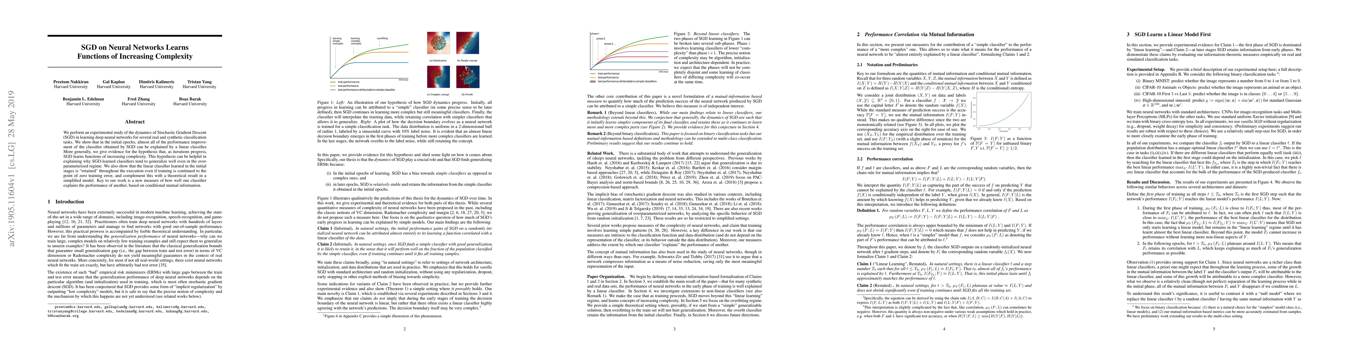 This study investigates Stochastic Gradient Descent (SGD) in training deep neural networks, demonstrating that early performance gains are largely due to linear classifiers, which evolve into more complex functions as training progresses. This complexity increase helps explain SGD's strong generalization, even in over-parameterized settings.