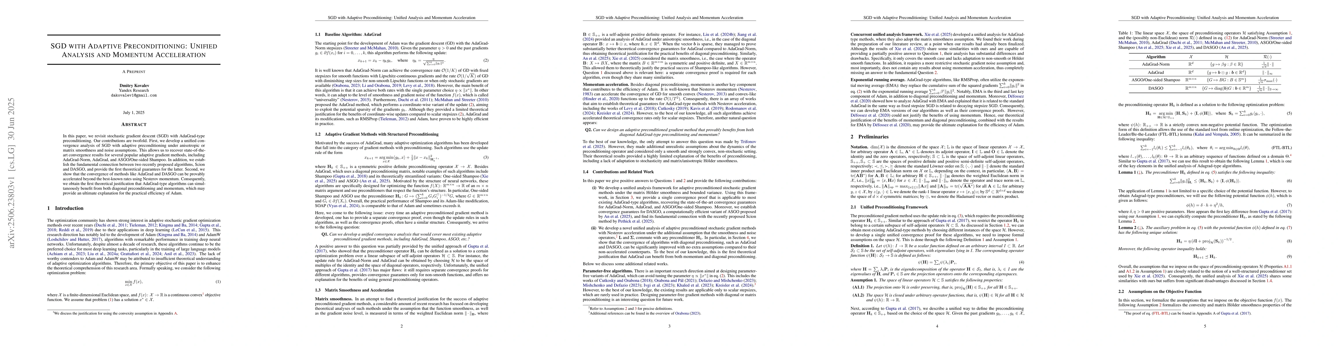 In this paper, we revisit stochastic gradient descent (SGD) with AdaGrad-type preconditioning. Our contributions are twofold. First, we develop a unified convergence analysis of SGD with adaptive preconditioning under anisotropic or matrix smoothness and noise assumptions. This allows us to recover state-of-the-art convergence results for several popular adaptive gradient methods, including AdaGrad-Norm, AdaGrad, and ASGO/One-sided Shampoo. In addition, we establish the fundamental connection between two recently proposed algorithms, Scion and DASGO, and provide the first theoretical guarantees for the latter. Second, we show that the convergence of methods like AdaGrad and DASGO can be provably accelerated beyond the best-known rates using Nesterov momentum. Consequently, we obtain the first theoretical justification that AdaGrad-type algorithms can simultaneously benefit from both diagonal preconditioning and momentum, which may provide an ultimate explanation for the practical efficiency of Adam.