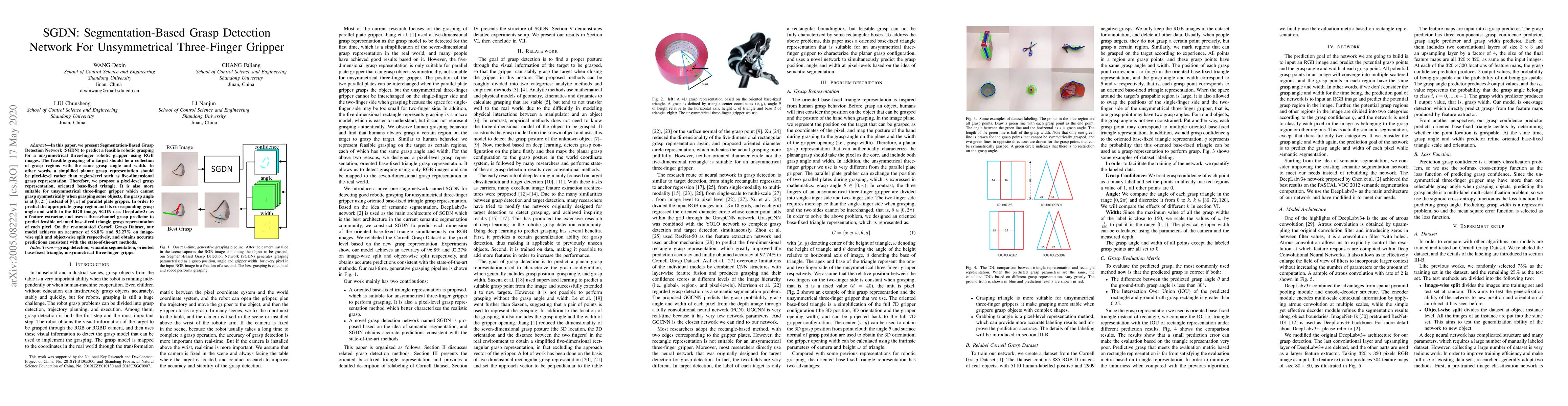 The paper introduces the Segmentation-Based Grasp Detection Network (SGDN) to predict feasible robotic grasps for an unsymmetrical three-finger gripper using RGB images. SGDN employs DeepLabv3+ and a three-channel grasp predictor to achieve a pixel-level grasp representation, achieving 96.8% and 92.27% accuracy on image-wise and object-wise splits respectively on the Cornell Grasp Dataset.