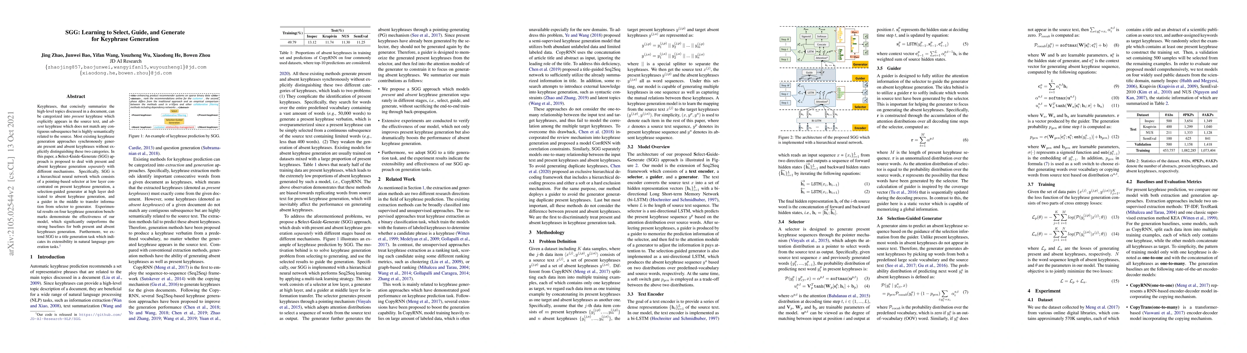 The paper proposes a Select-Guide-Generate (SGG) approach for keyphrase generation, distinguishing between present and absent keyphrases using separate mechanisms. The model significantly outperforms baselines on keyphrase generation benchmarks and extends to title generation tasks.