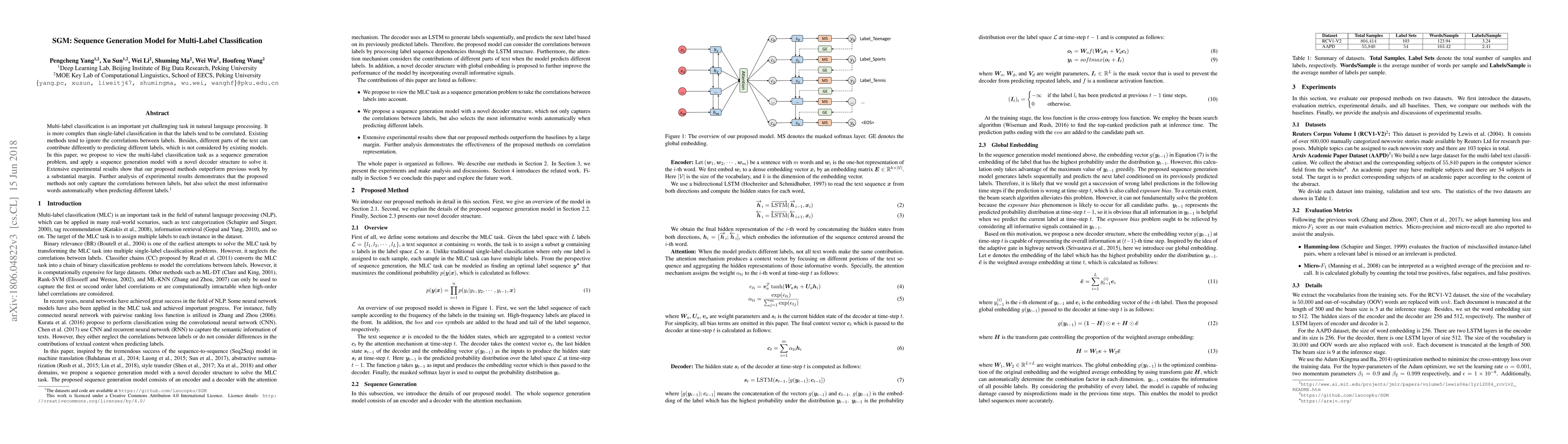 The paper proposes a Sequence Generation Model (SGM) for multi-label classification, treating it as a sequence generation problem with a novel decoder structure that captures label correlations and selects informative words, outperforming existing methods. Experimental results show significant improvements and enhanced understanding of label relationships and word importance.