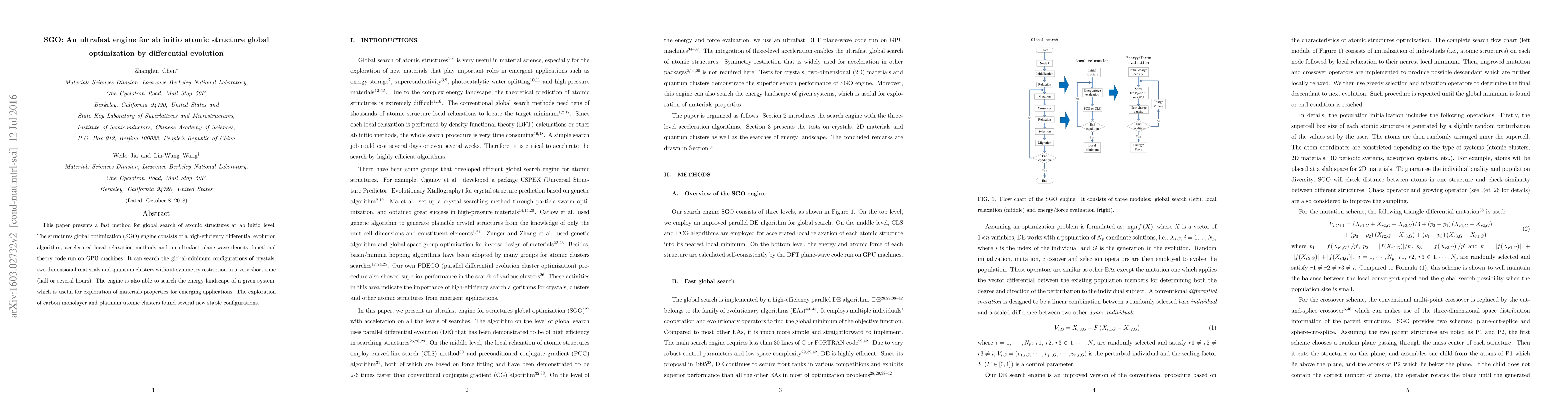 This paper introduces SGO, a fast global optimization engine for atomic structures using differential evolution and GPU-accelerated density functional theory, capable of discovering stable configurations in crystals, materials, and clusters within hours. It successfully identified new stable structures in carbon monolayers and platinum clusters.