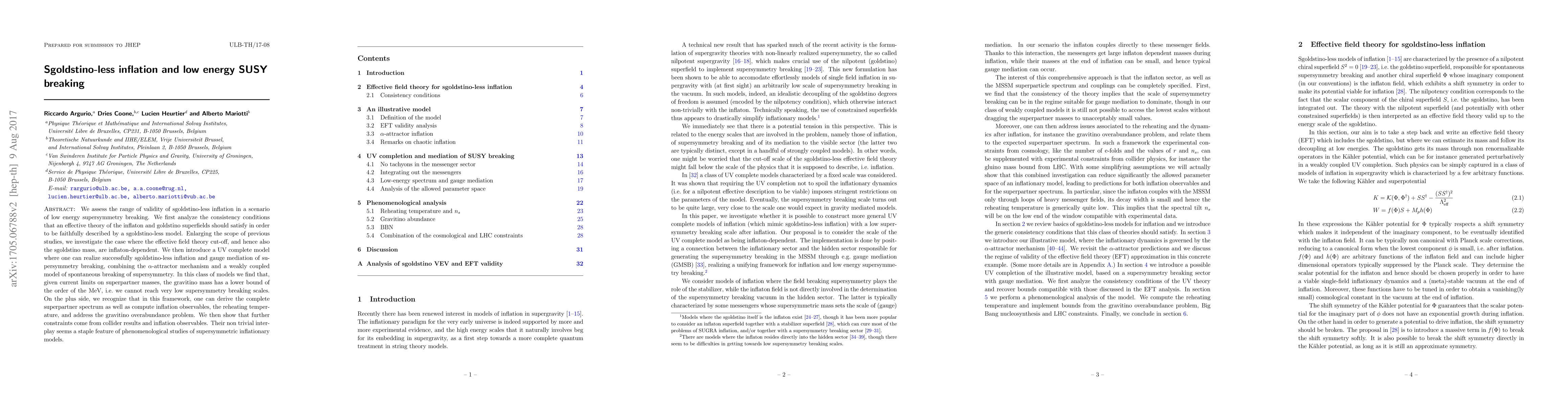 We assess the range of validity of sgoldstino-less inflation in a scenario of low energy supersymmetry breaking. We first analyze the consistency conditions that an effective theory of the inflaton and goldstino superfields should satisfy in order to be faithfully described by a sgoldstino-less model. Enlarging the scope of previous studies, we investigate the case where the effective field theory cut-off, and hence also the sgoldstino mass, are inflaton-dependent. We then introduce a UV complete model where one can realize successfully sgoldstino-less inflation and gauge mediation of supersymmetry breaking, combining the alpha-attractor mechanism and a weakly coupled model of spontaneous breaking of supersymmetry. In this class of models we find that, given current limits on superpartner masses, the gravitino mass has a lower bound of the order of the MeV, i.e. we cannot reach very low supersymmetry breaking scales. On the plus side, we recognize that in this framework, one can derive the complete superpartner spectrum as well as compute inflation observables, the reheating temperature, and address the gravitino overabundance problem. We then show that further constraints come from collider results and inflation observables. Their non trivial interplay seems a staple feature of phenomenological studies of supersymmetric inflationary models.