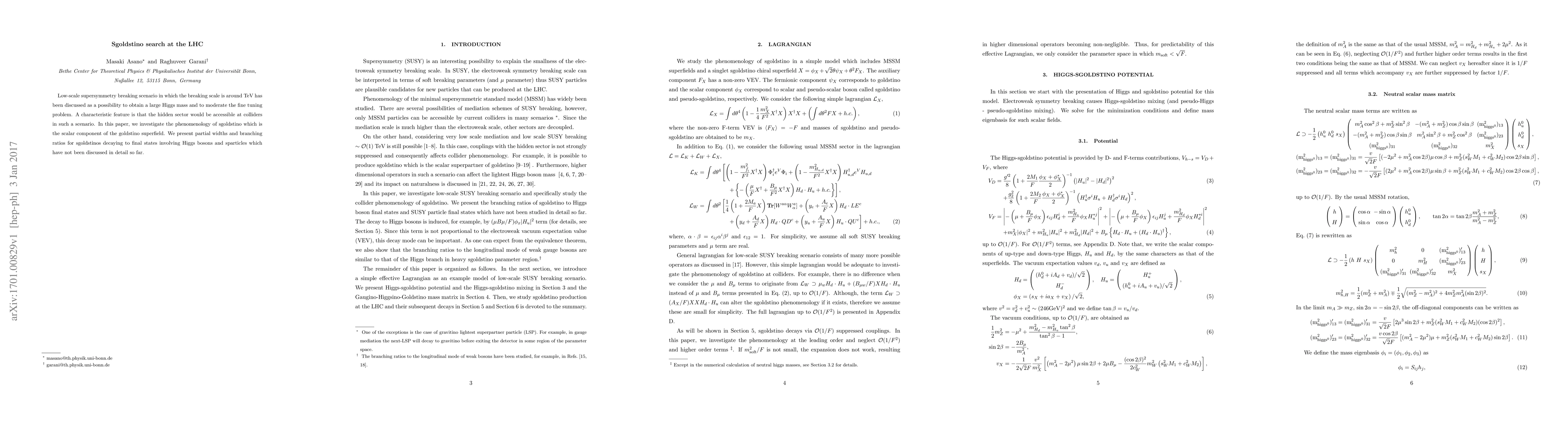 Low-scale supersymmetry breaking scenario in which the breaking scale is around TeV has been discussed as a possibility to obtain a large Higgs mass and to moderate the fine tuning problem. A characteristic feature is that the hidden sector would be accessible at colliders in such a scenario. In this paper, we investigate the phenomenology of sgoldstino which is the scalar component of the goldstino superfield. We present partial widths and branching ratios for sgoldstinos decaying to final states involving Higgs bosons and sparticles which have not been discussed in detail so far.