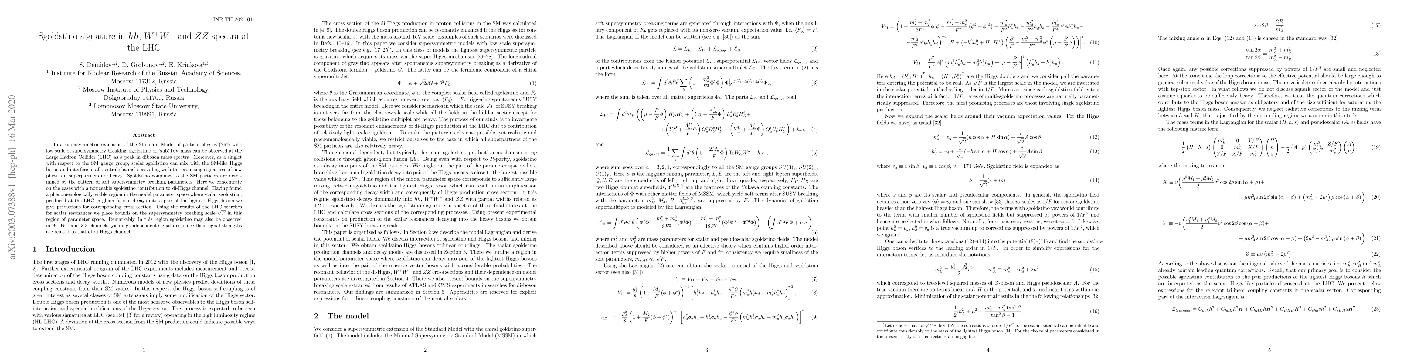 This paper explores the potential observation of the sgoldstino, a supersymmetric particle, at the LHC through its decay into di-Higgs, $W^+W^-$, and $ZZ$ pairs. It identifies a viable parameter region where sgoldstino signatures can be detected, providing bounds on the supersymmetry breaking scale.