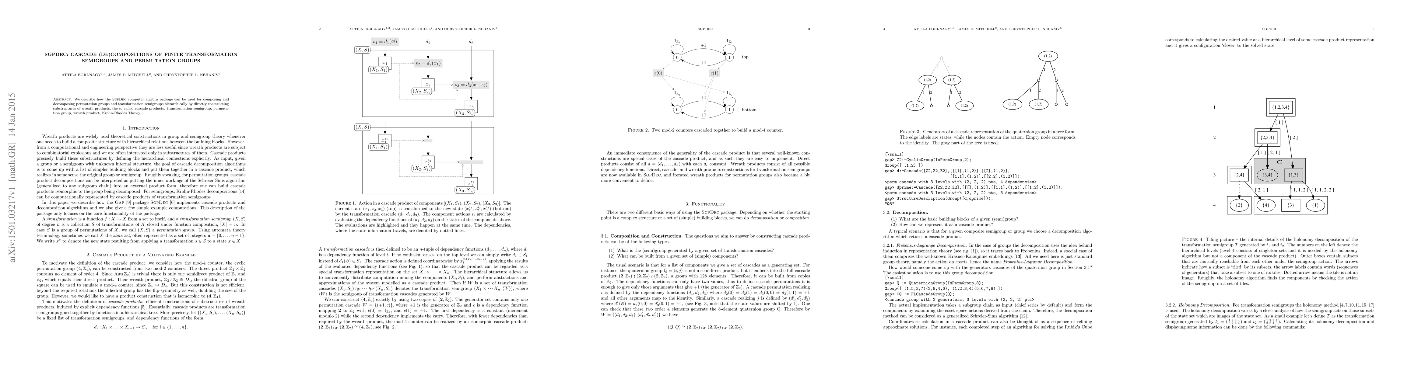 Summary: The SgpDec package facilitates the hierarchical composition and decomposition of permutation groups and transformation semigroups through the construction of cascade products, which are substructures of wreath products. This tool aids in the detailed analysis of these algebraic structures.